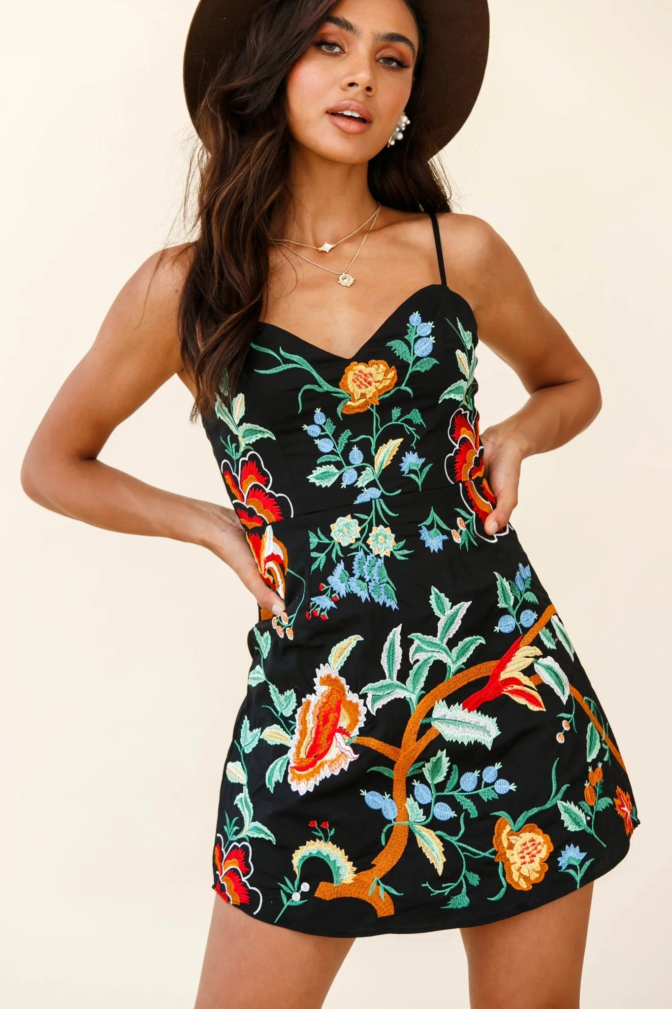 Ana Spaghetti Strap Floral Embroidered Dress Black