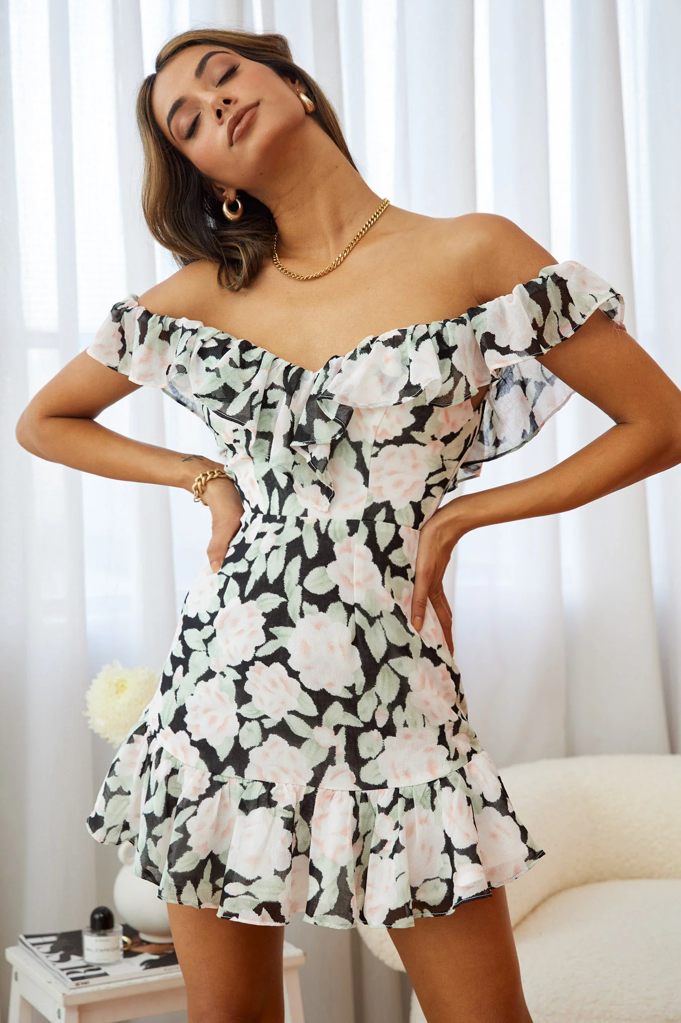 Sweet Melody Sweetheart Neckline Off-Shoulder Dress Floral Print Black/Nude