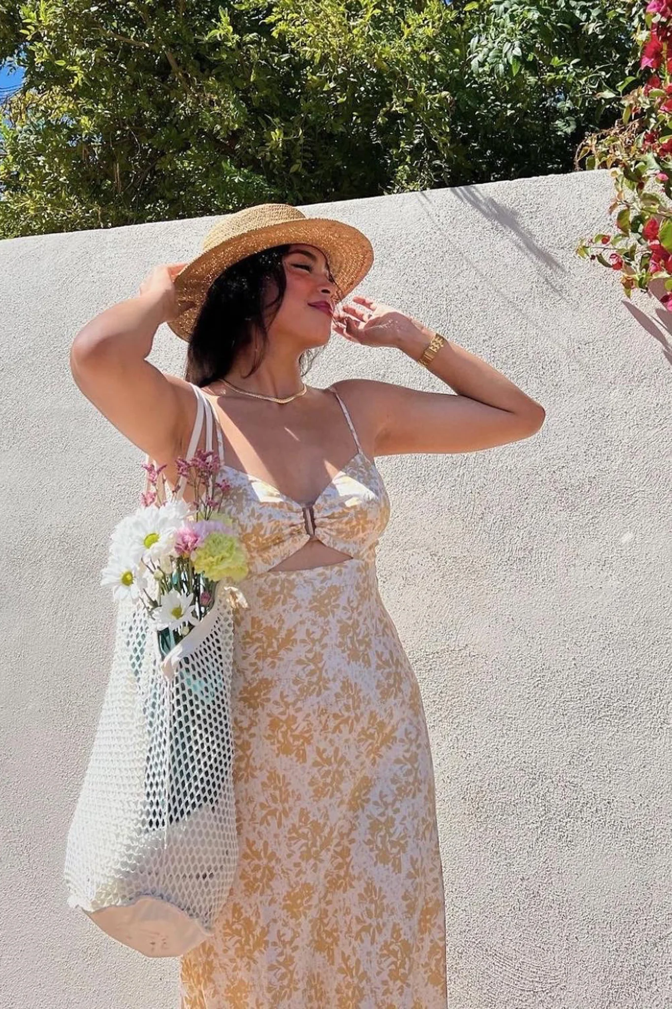 Melancholy Resin Buckle Midi Dress Floral Stencil Print White/Yellow