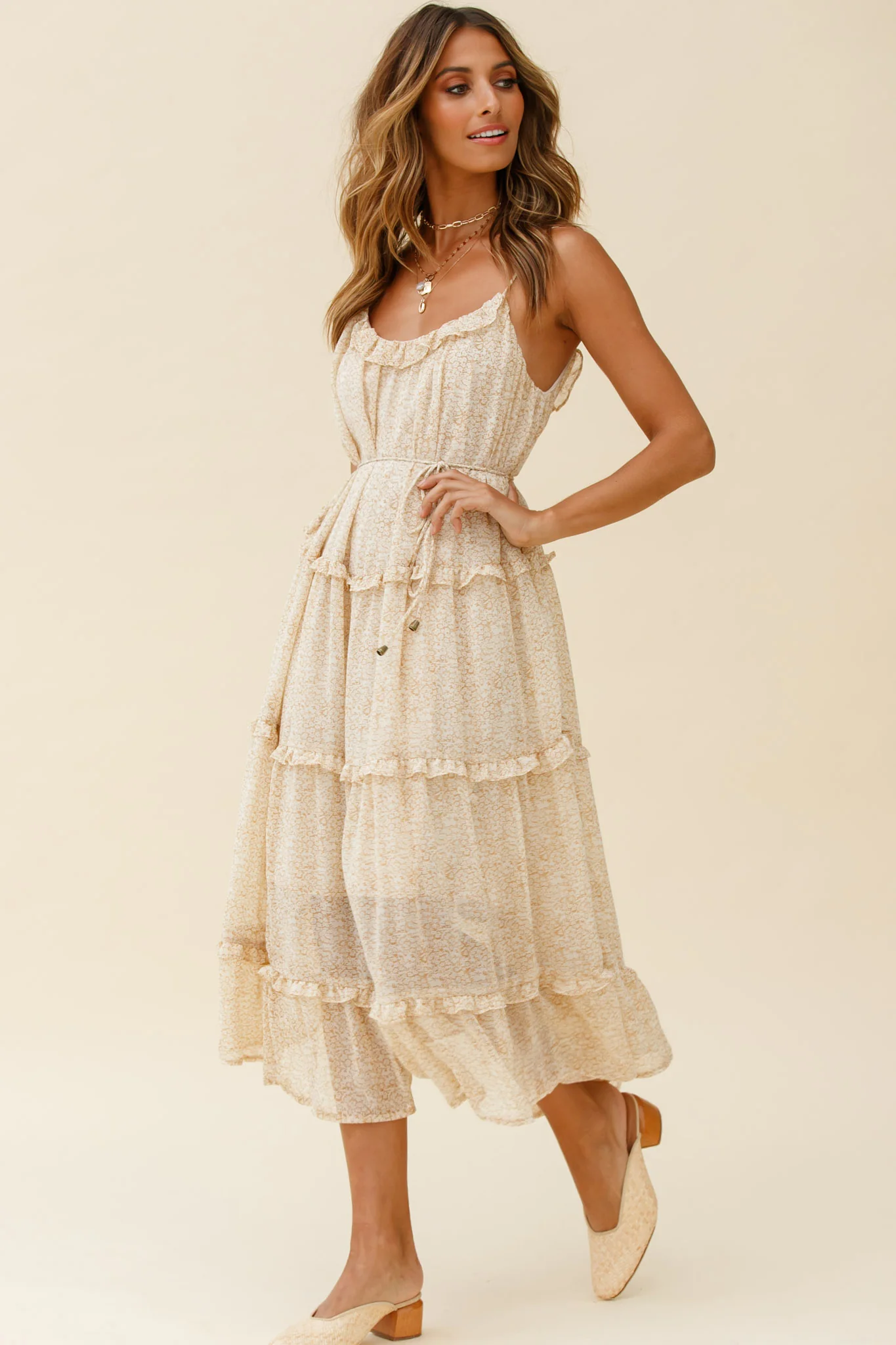 Daybreak Frill Trim String Tie Waist Midi Dress Floral Print Beige