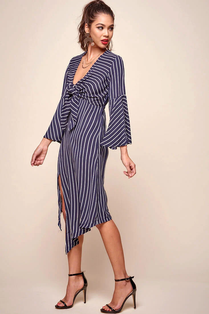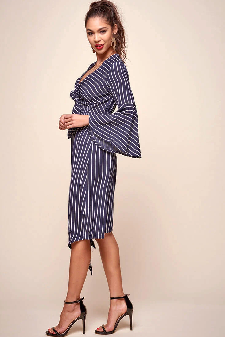 Jaedyn Waist Tie Bell Sleeve Dress Navy