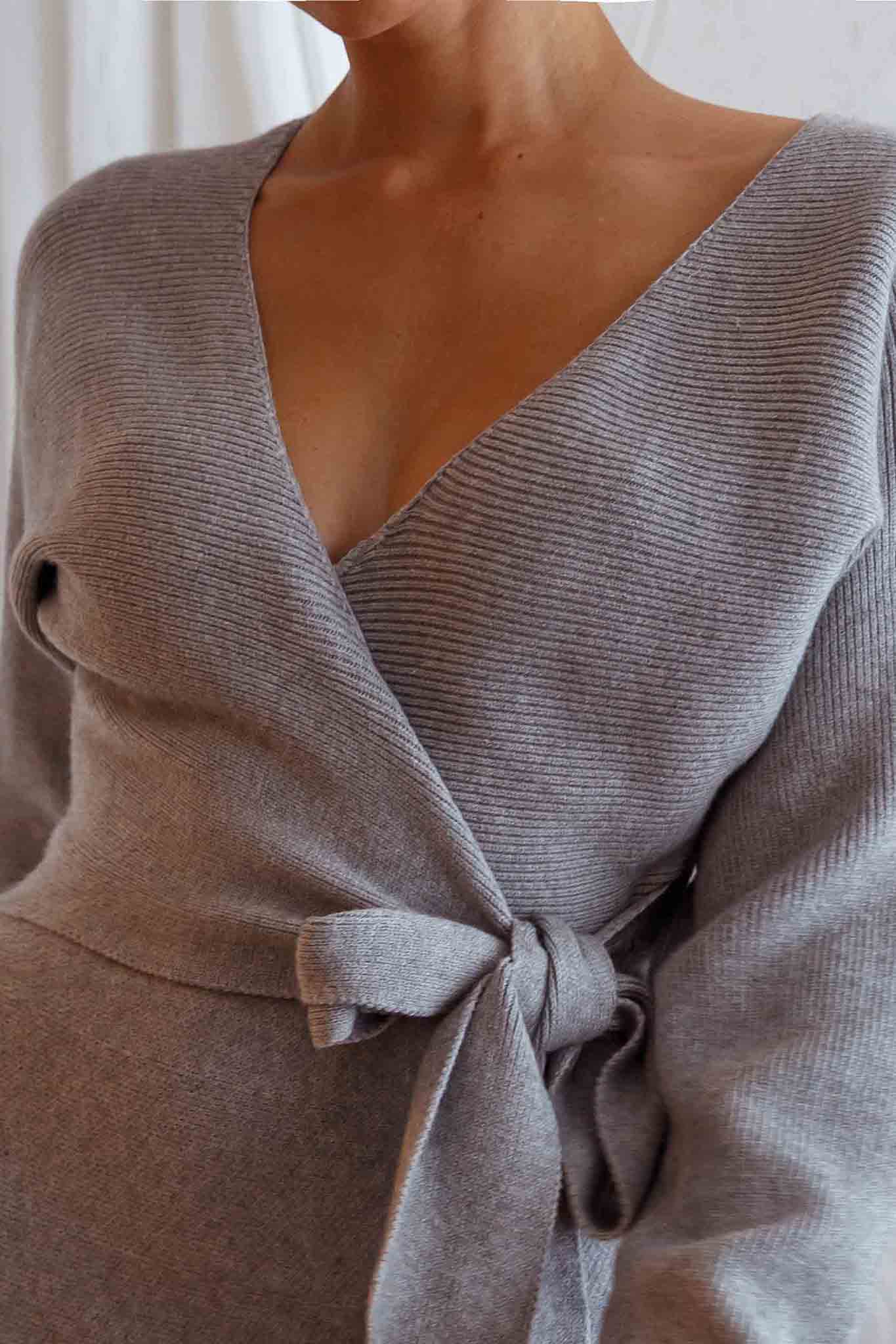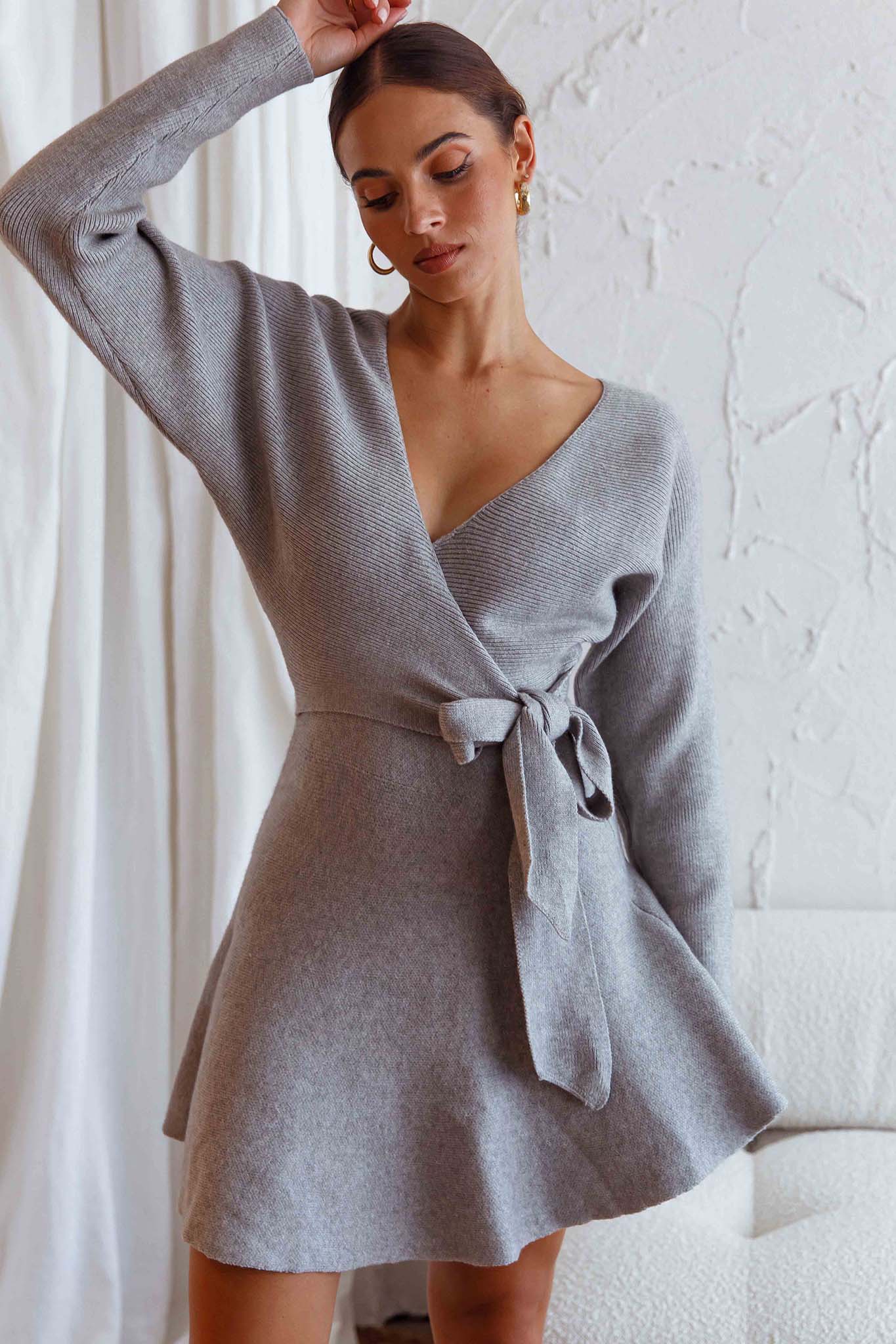 Shooting Star Long Sleeve Side Tie Knit Dress Grey