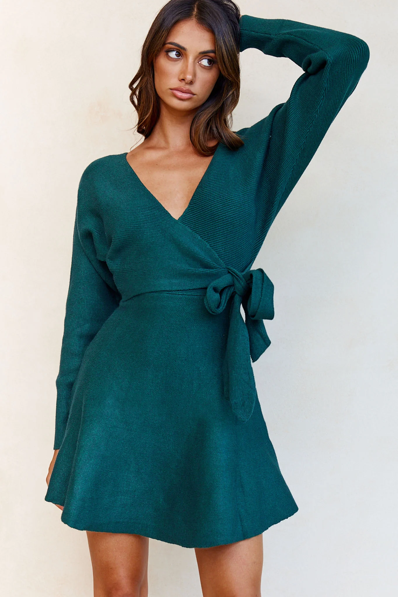 Shooting Star Long Sleeve Side Tie Knit Dress Forest Green