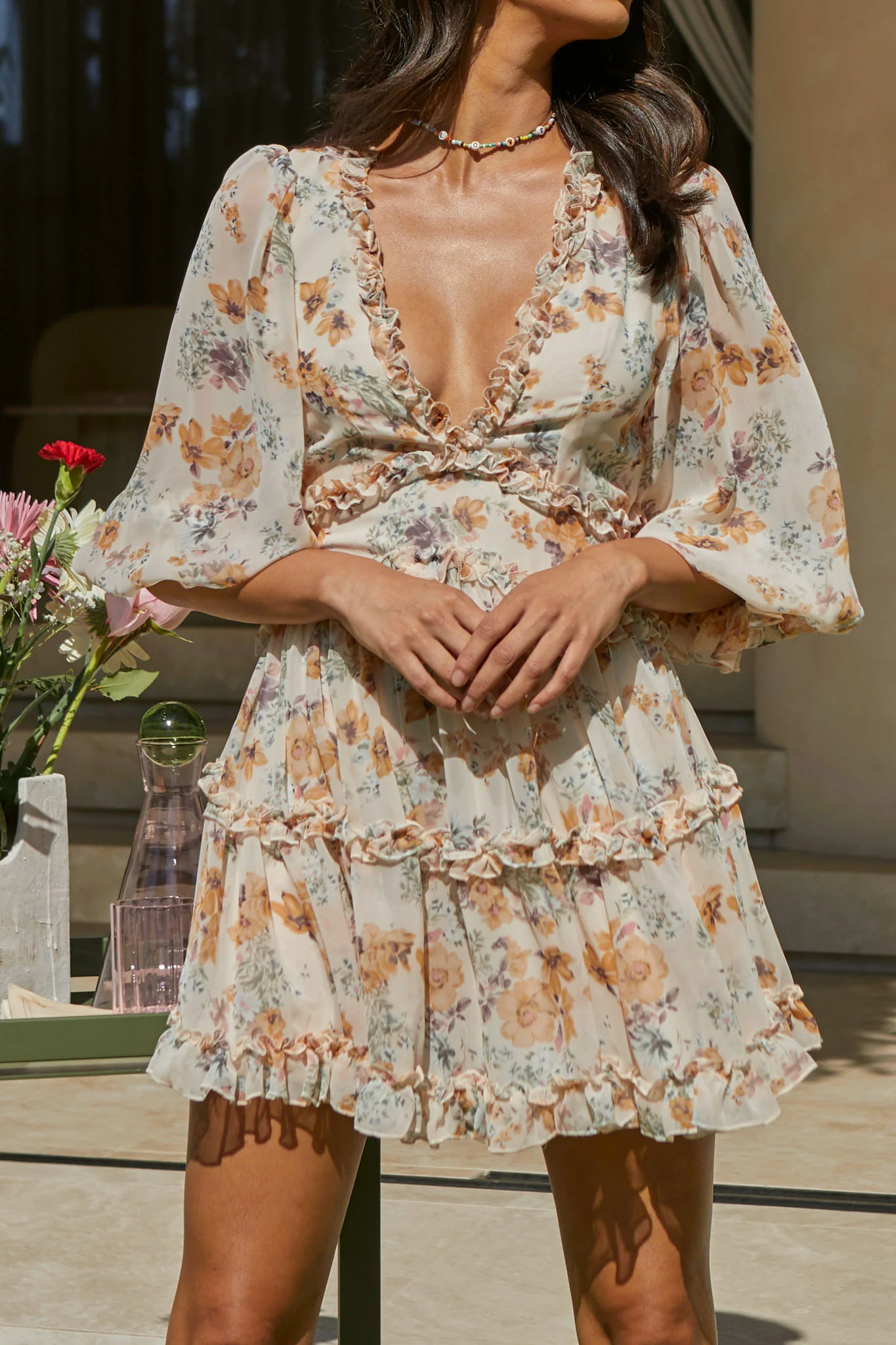 Laney Cutout Back Ruffle Trim Dress Vintage Floral Print Beige