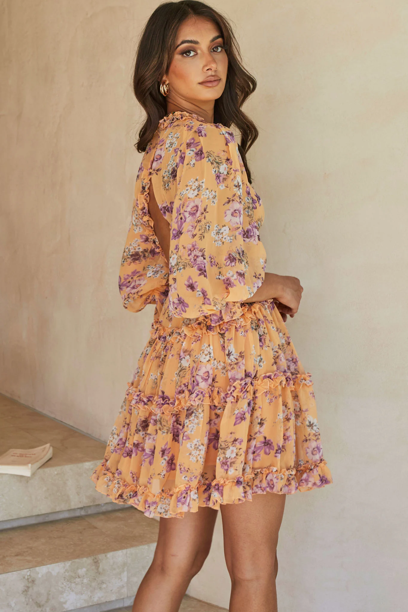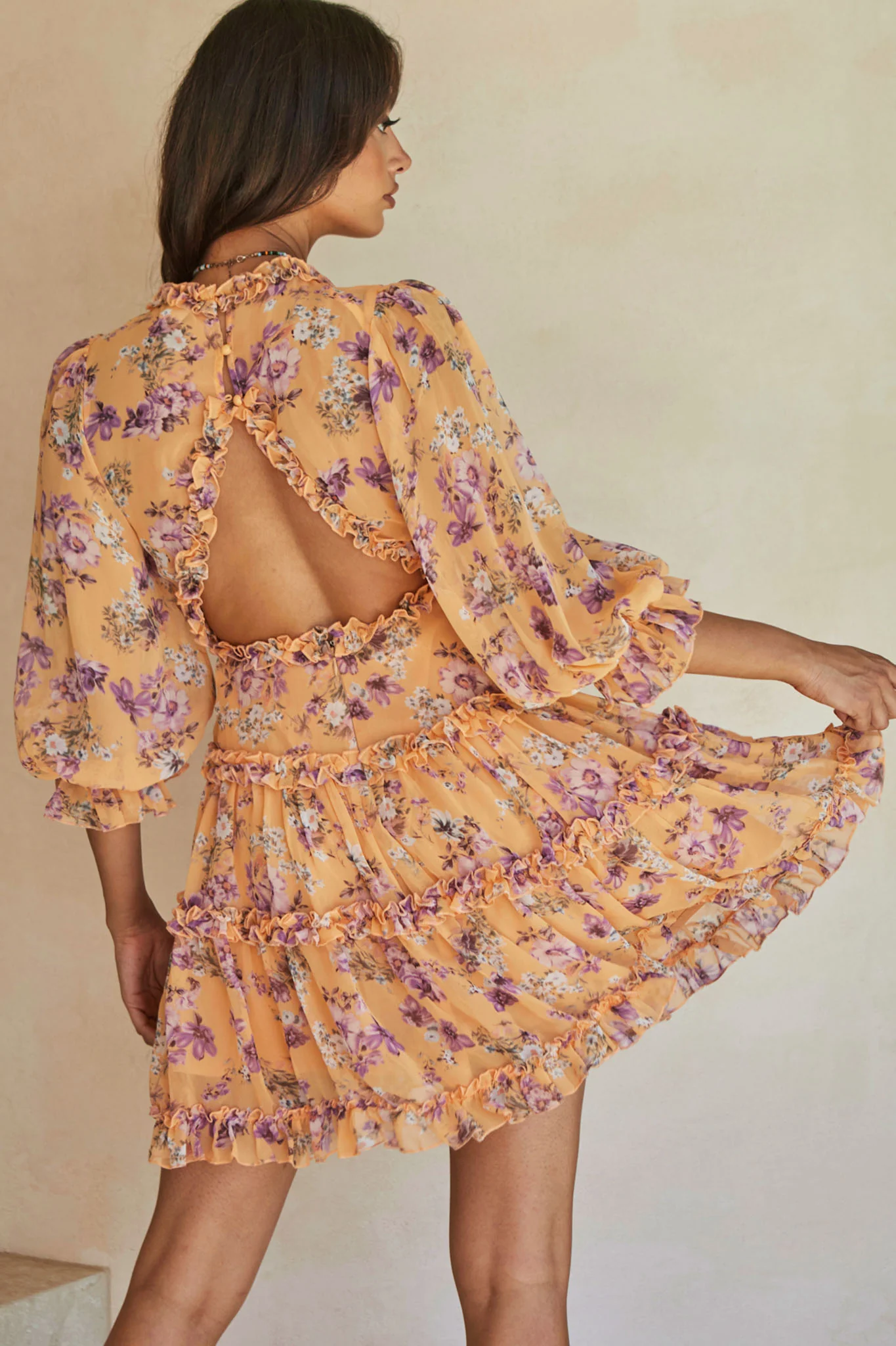 Laney Cutout Back Ruffle Trim Dress Vintage Floral Print Apricot