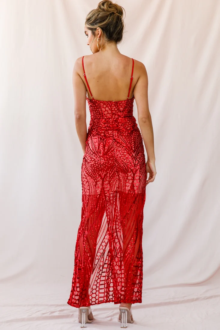 Miya Sequin Overlay Plunging Neckline Dress Red