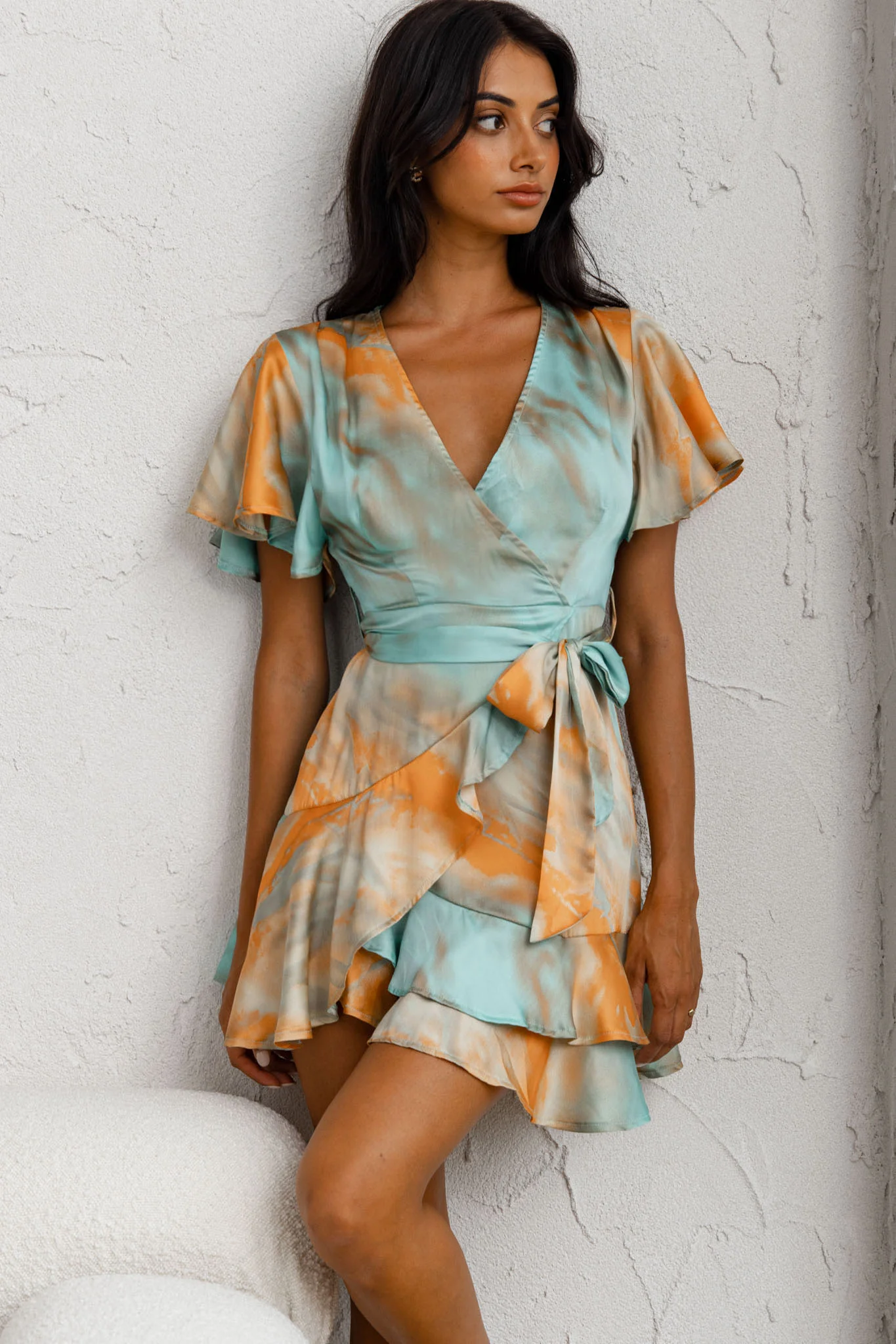 Cami Angel Sleeve Faux Wrap Dress Tie-Dye Print Aqua/Orange