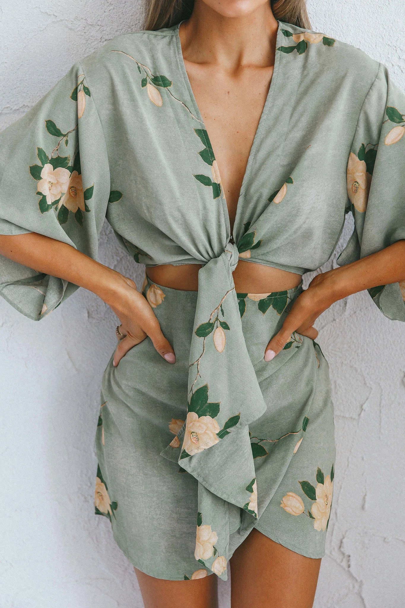 Rivera Deep-V Waist-Tie Dress Rose Floral Print Sage