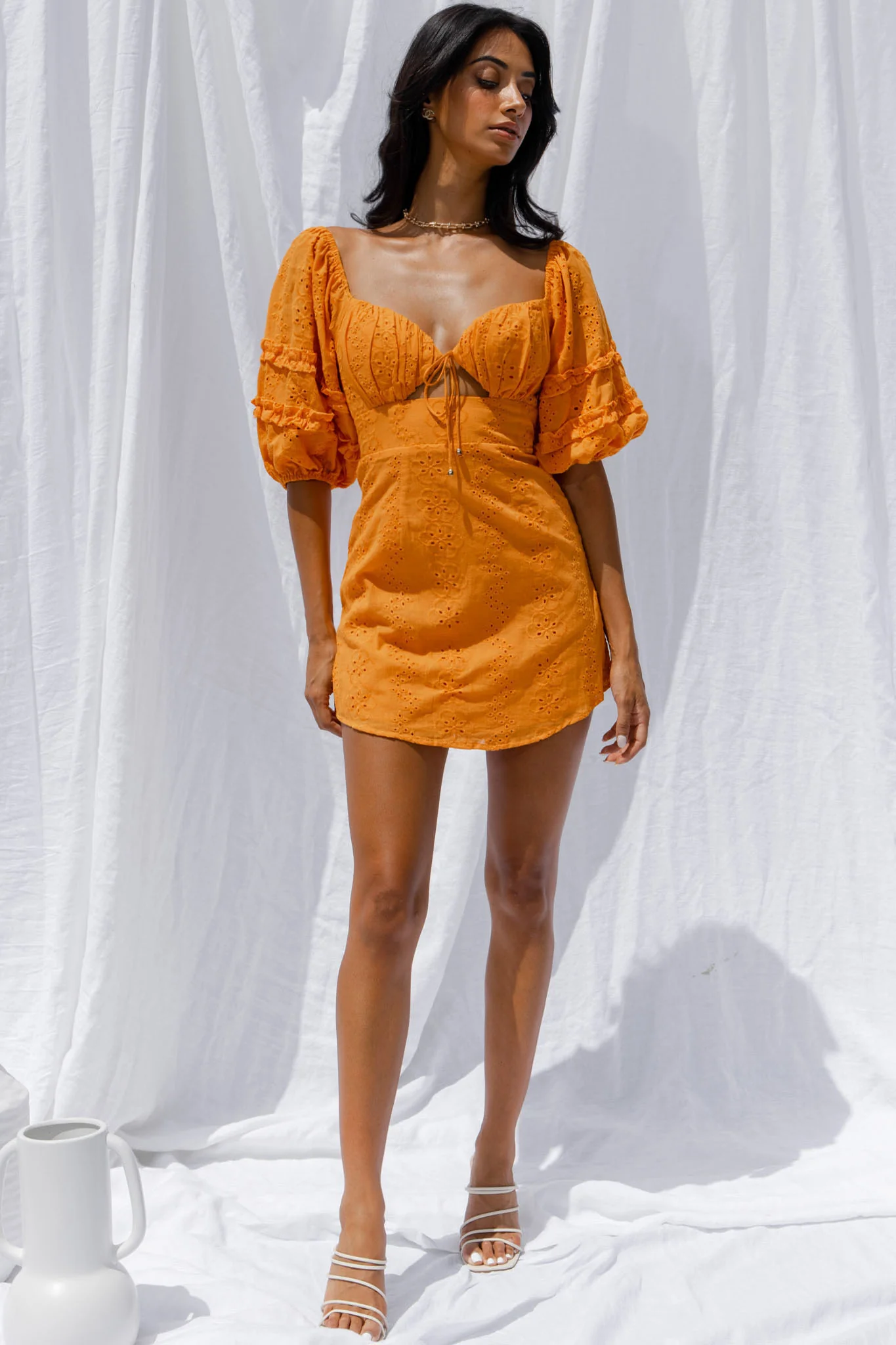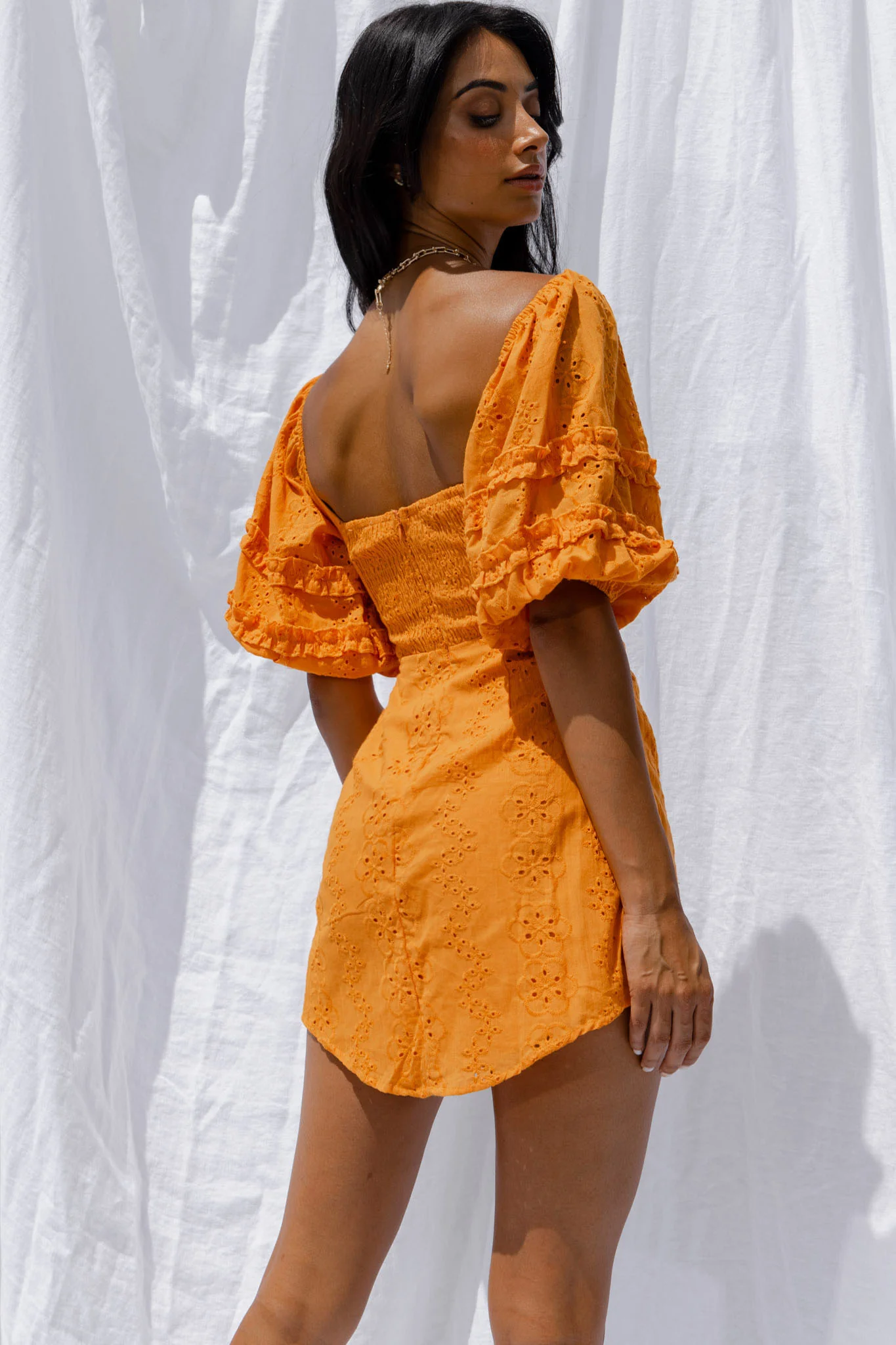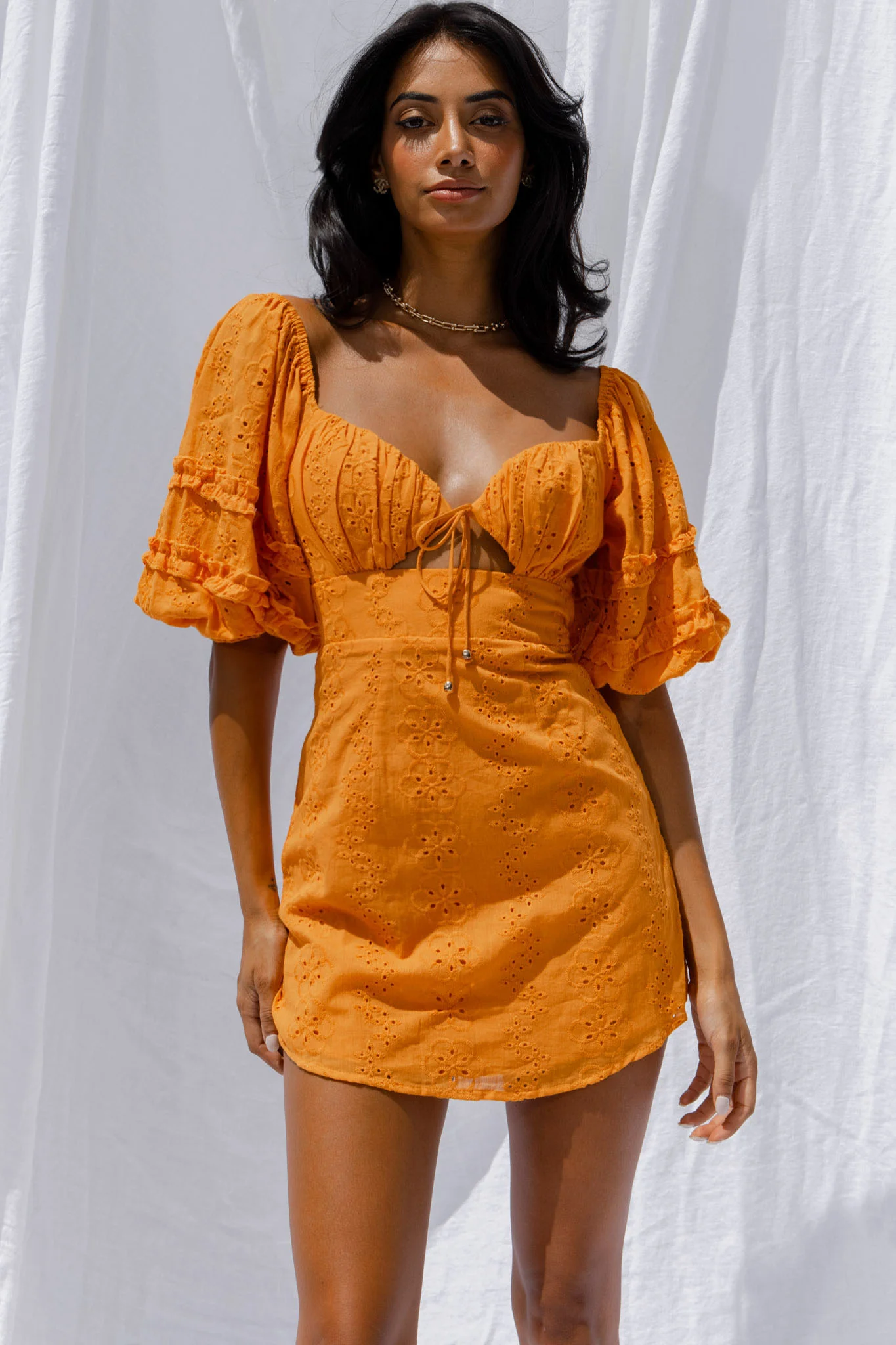 Sweet Romance Puff Sleeve Eyelet Mini Dress Sunset