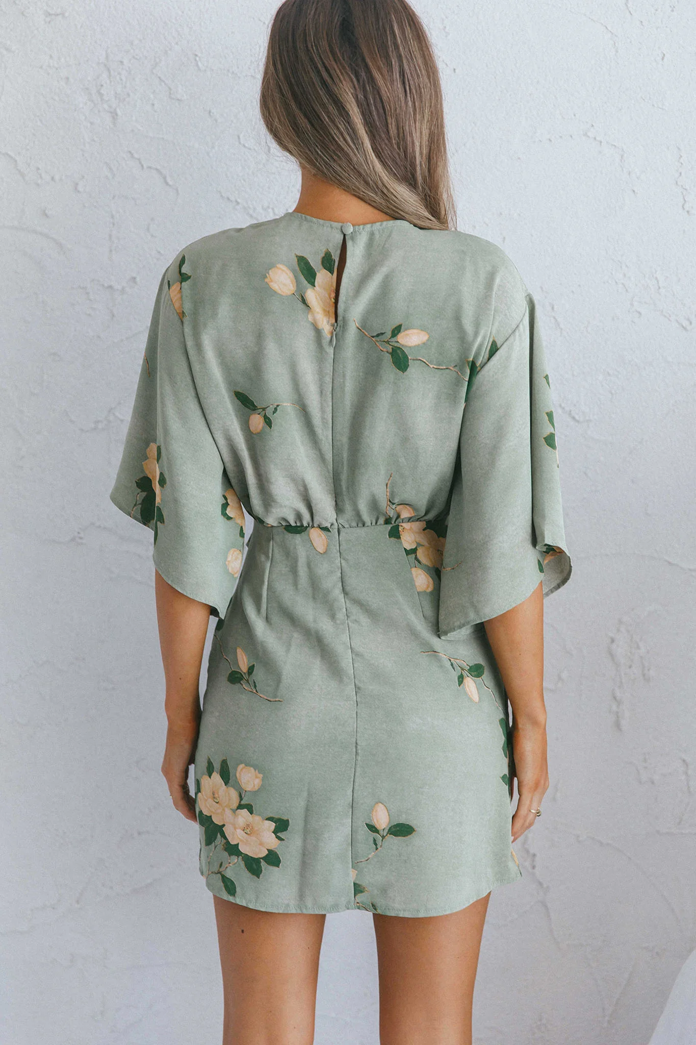 Never Part Puff Sleeve Ruched Low Back Mini Dress Floral Print Green