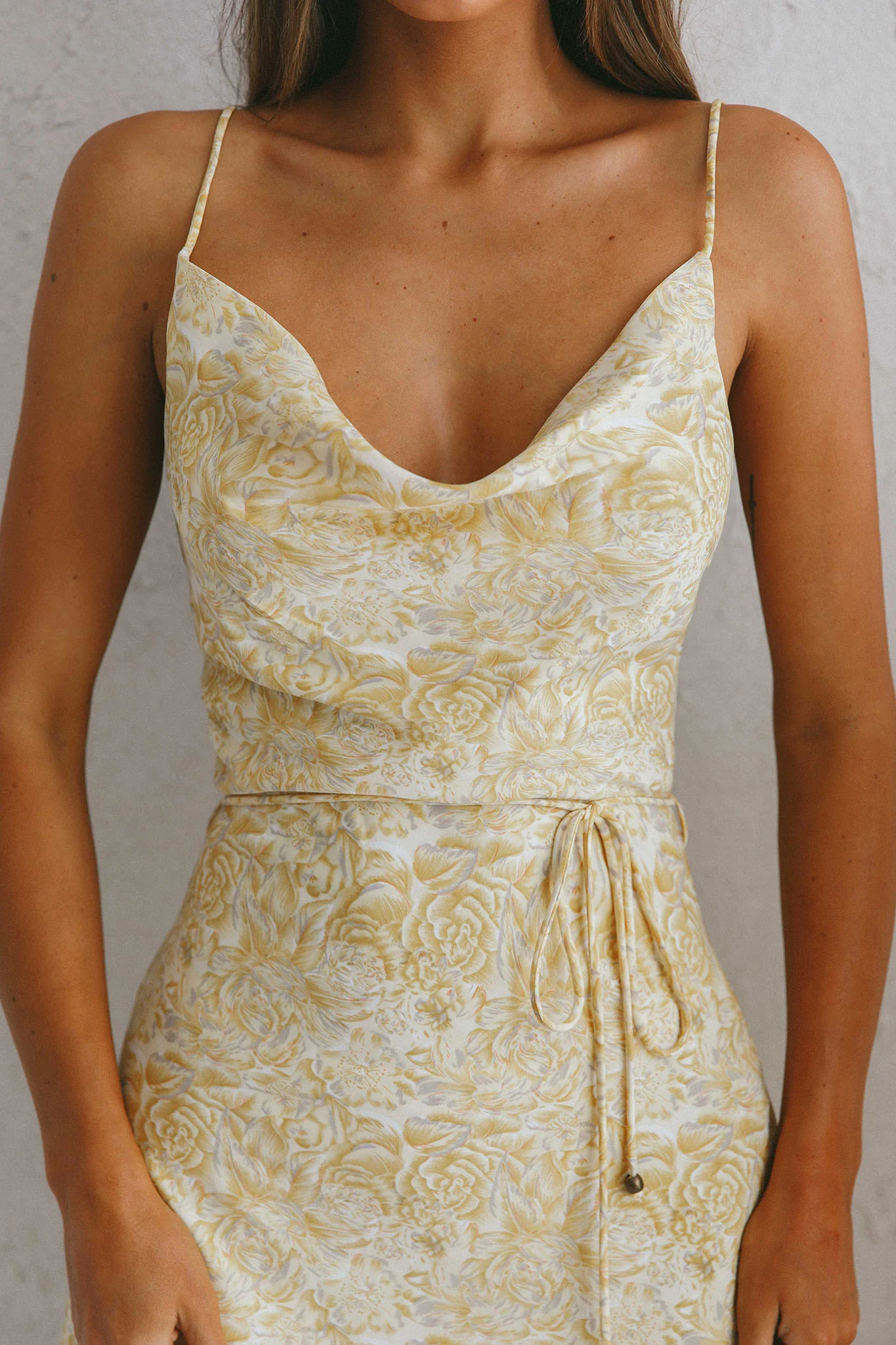 Sweet Memories Cowl Neckline Slip Dress Vintage Floral Print Yellow