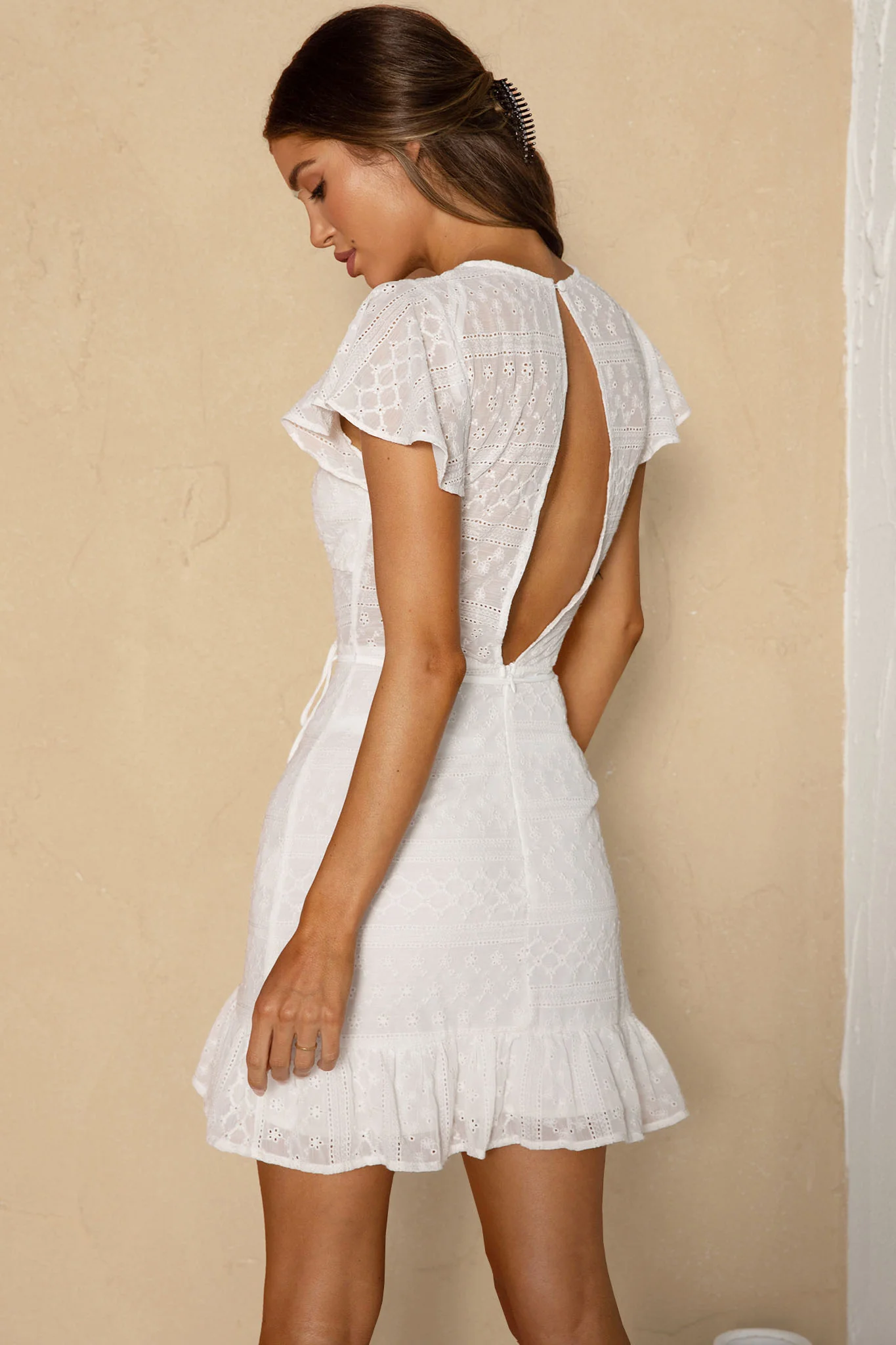Moving On Flutter Sleeve String Tie Waist Eyelet Mini Dress White