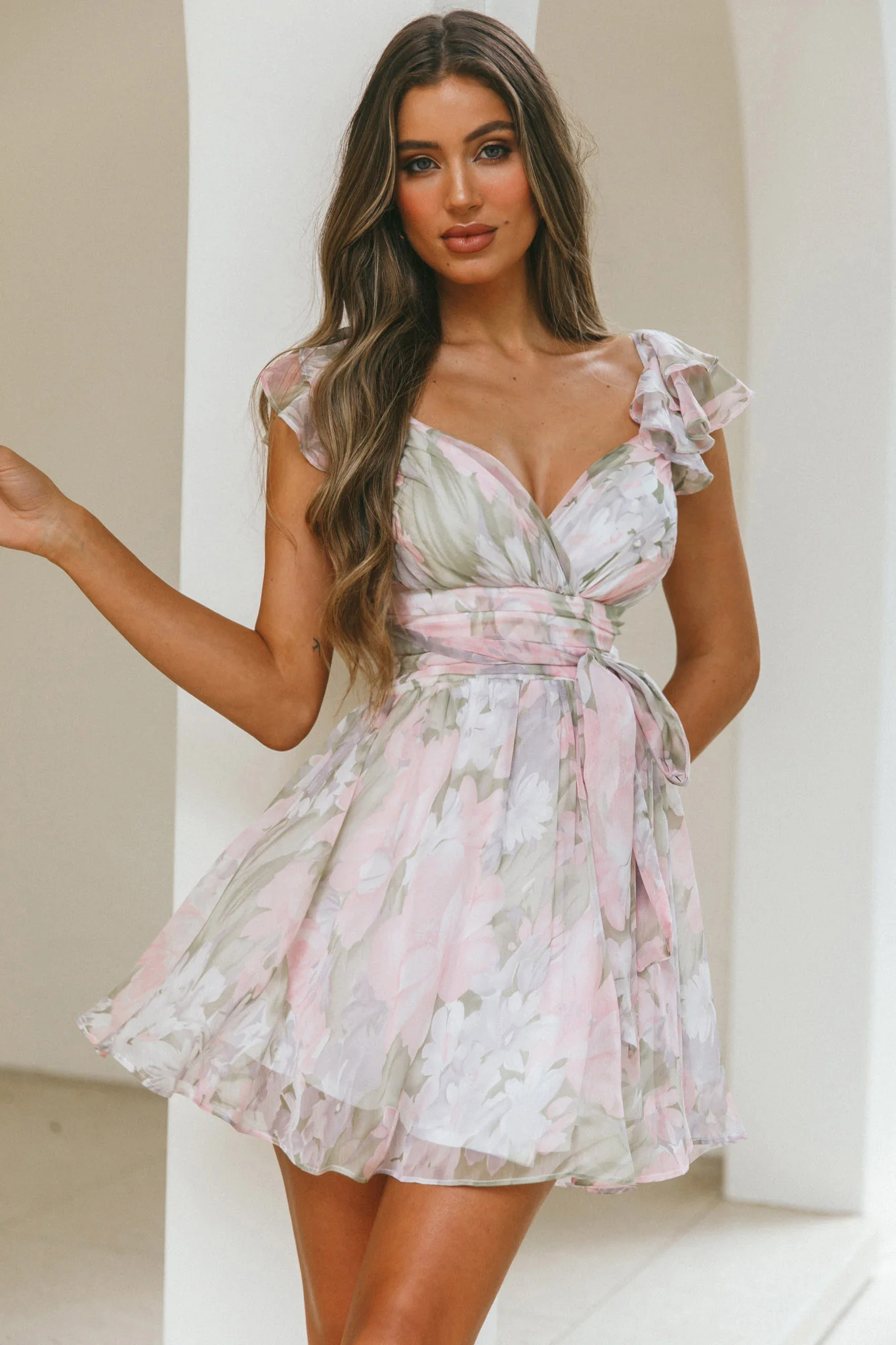 Lola Ruffle Shoulder Ruched Dress Watercolor Floral Pink Multi