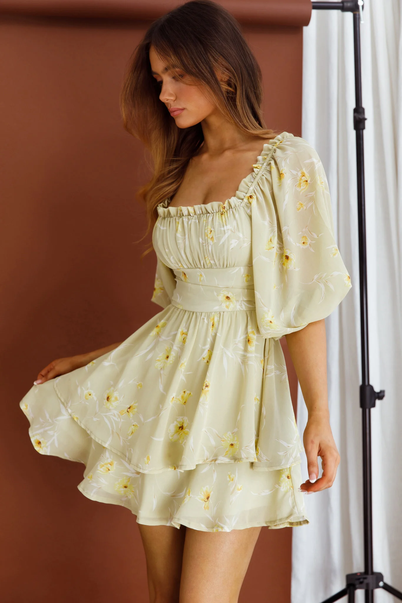 Devoted Structured Bust Puff Sleeve Dress Lily Print Pistachio
