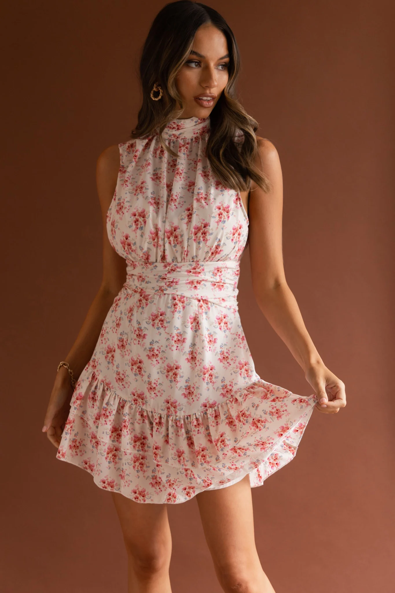 Miami Nights Cowl Neckline Twist Feature Mini Dress Floral Orange
