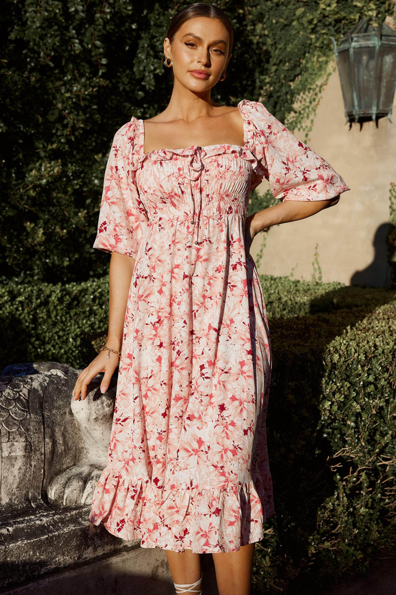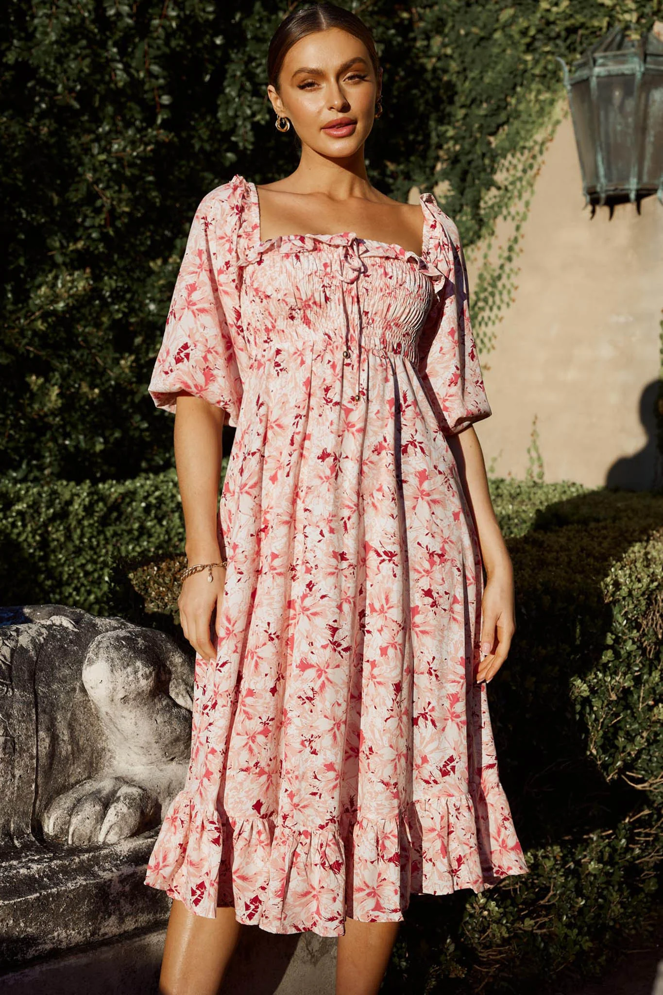 Flynn Balloon Sleeve Shirred Midi Dress Floral Pink