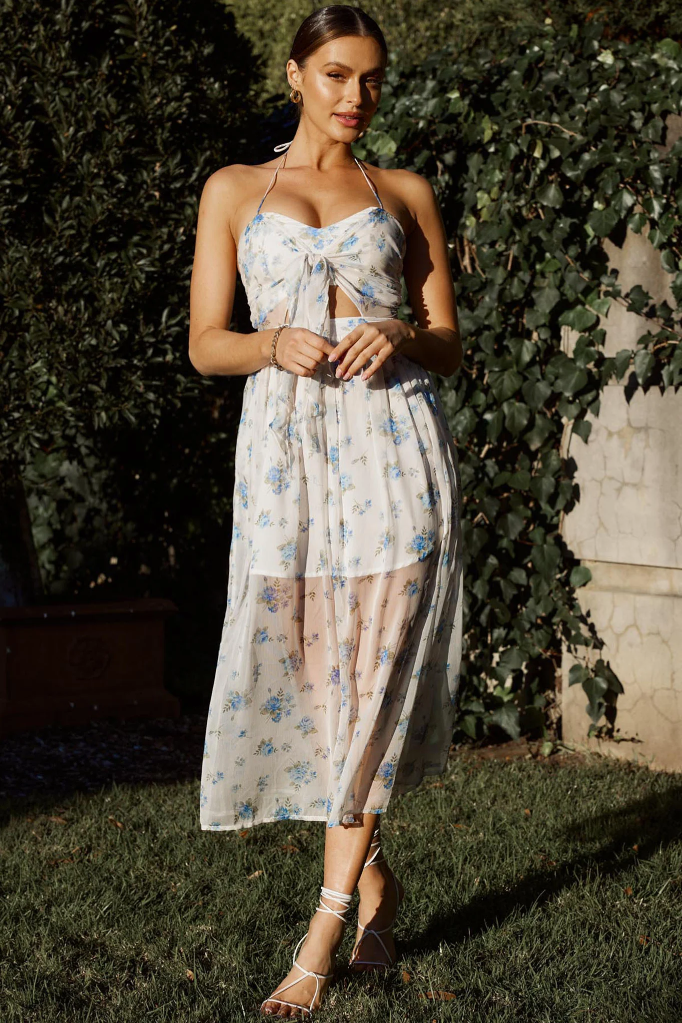 Los Feliz Tied Bust Halterneck Midi Dress Sheer Floral Blue