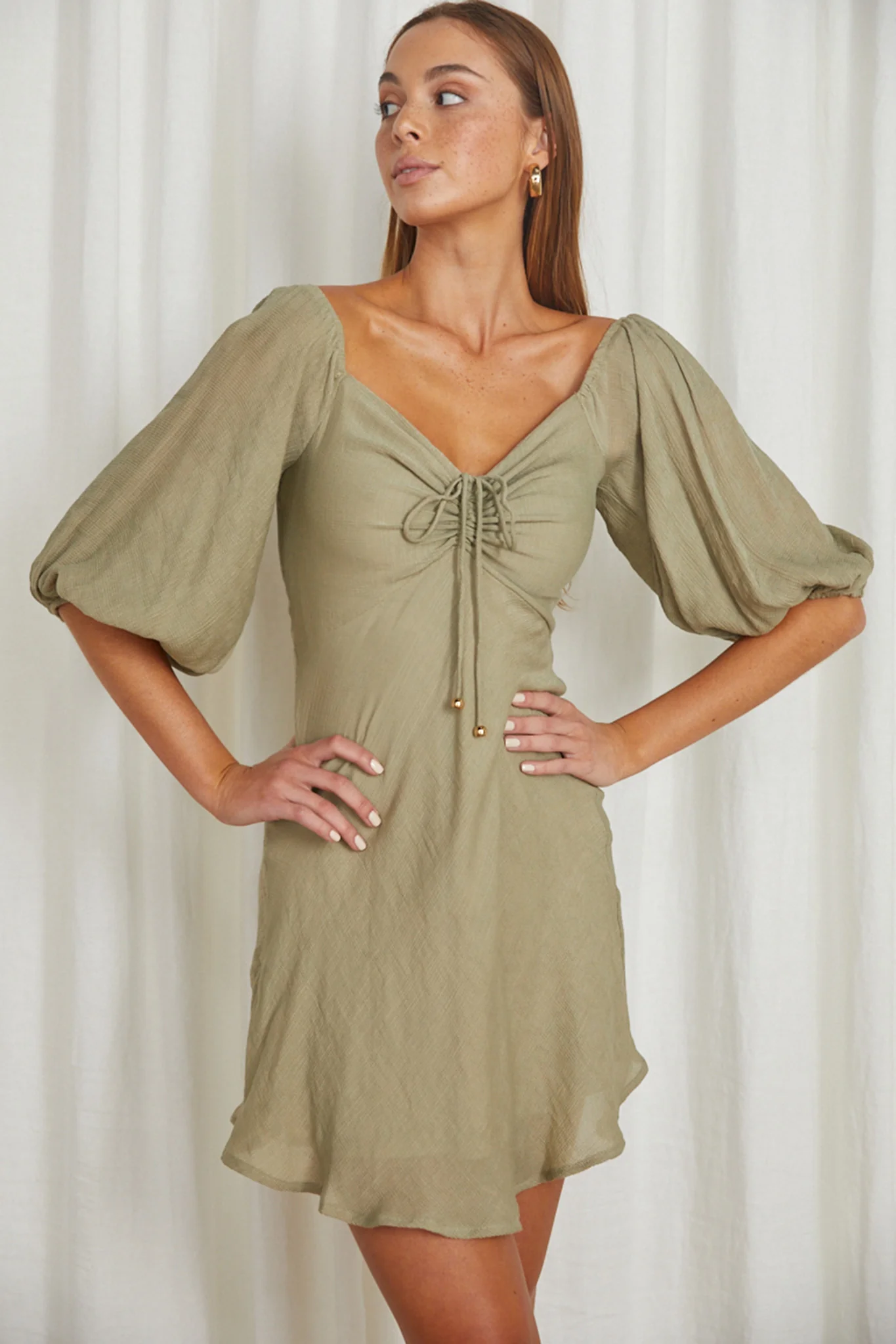 Georgina Ruched Sleeve Tea Dress Stencil Print Sage