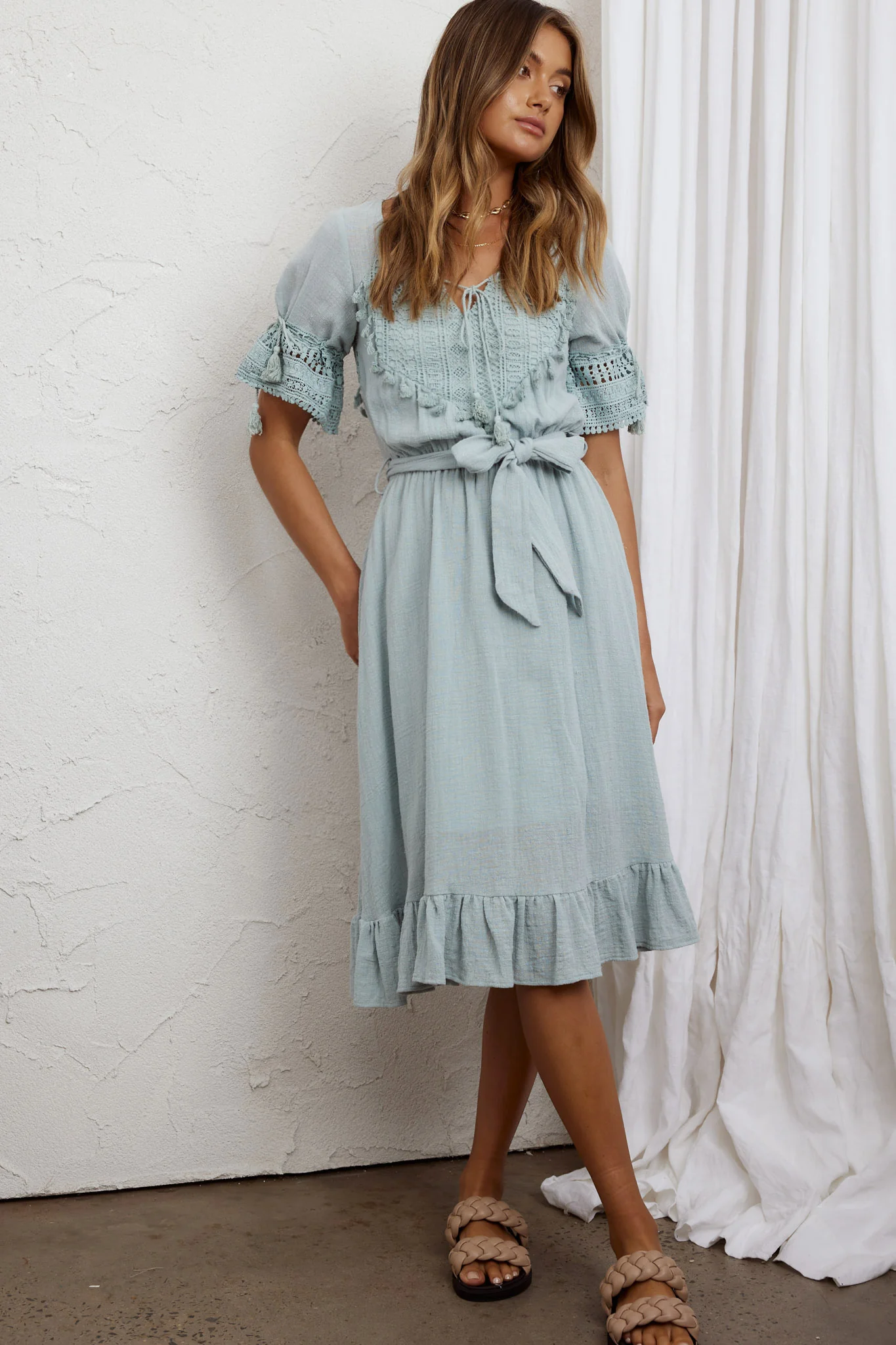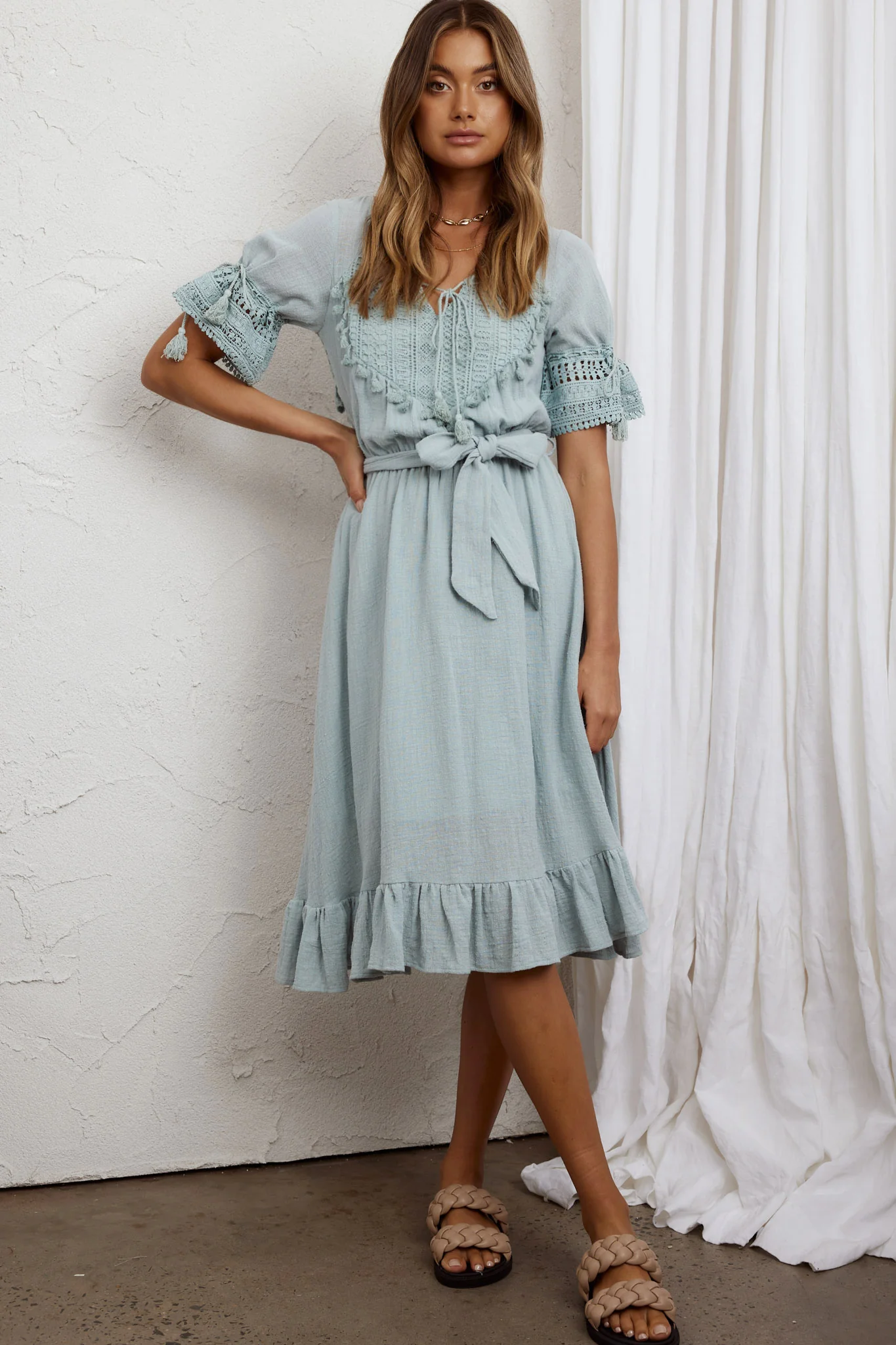 Jada Short Sleeve Crochet Tassel Midi Dress Sage