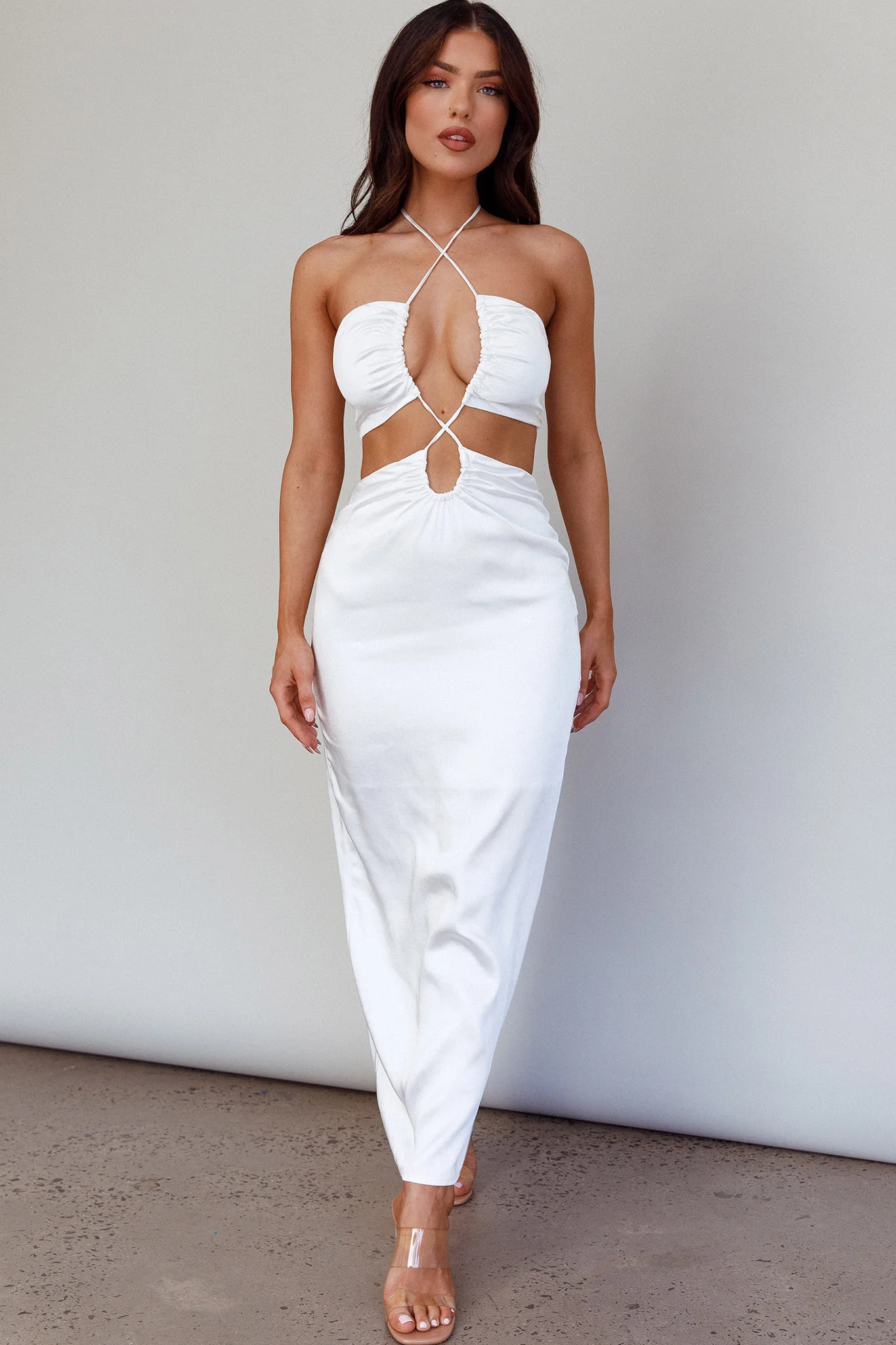 Raye Cut-Out Waist Rhinestone Midi Dress White