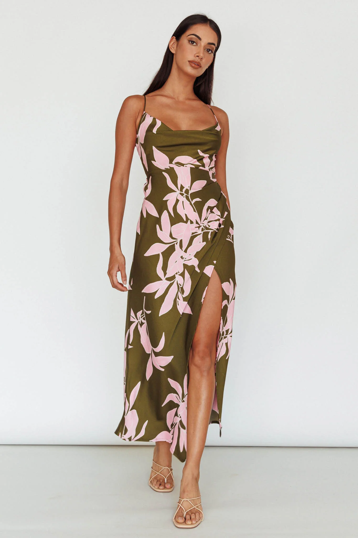 Dream Crush Lace-Up Back Side Split Midi Dress Khaki