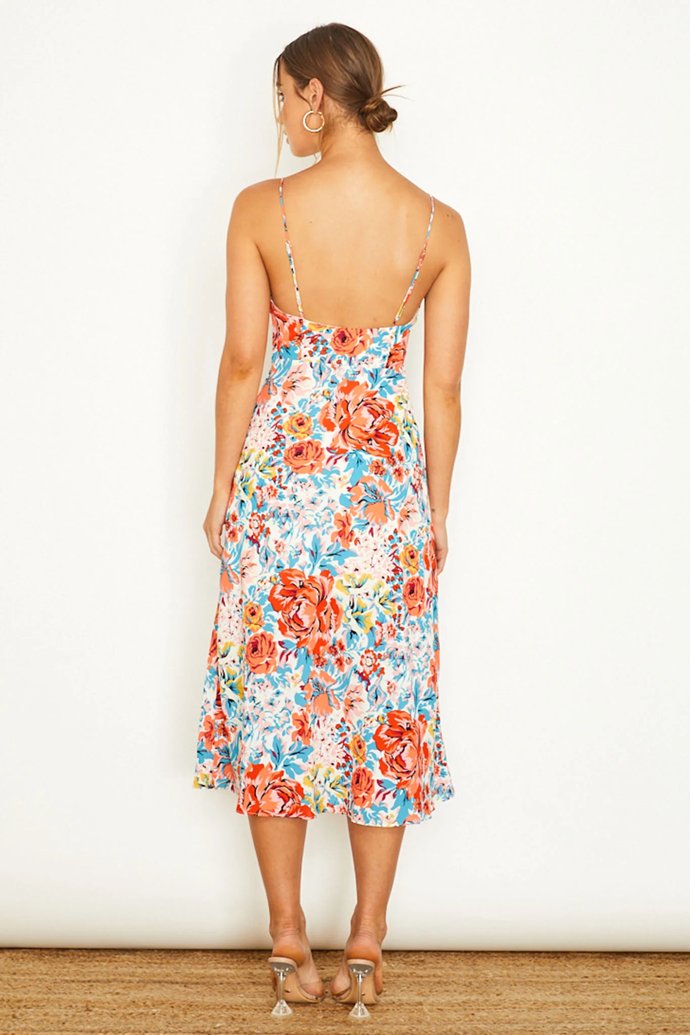 Malibu Gathered Bust Cami Strap Midi Dress Floral Orange