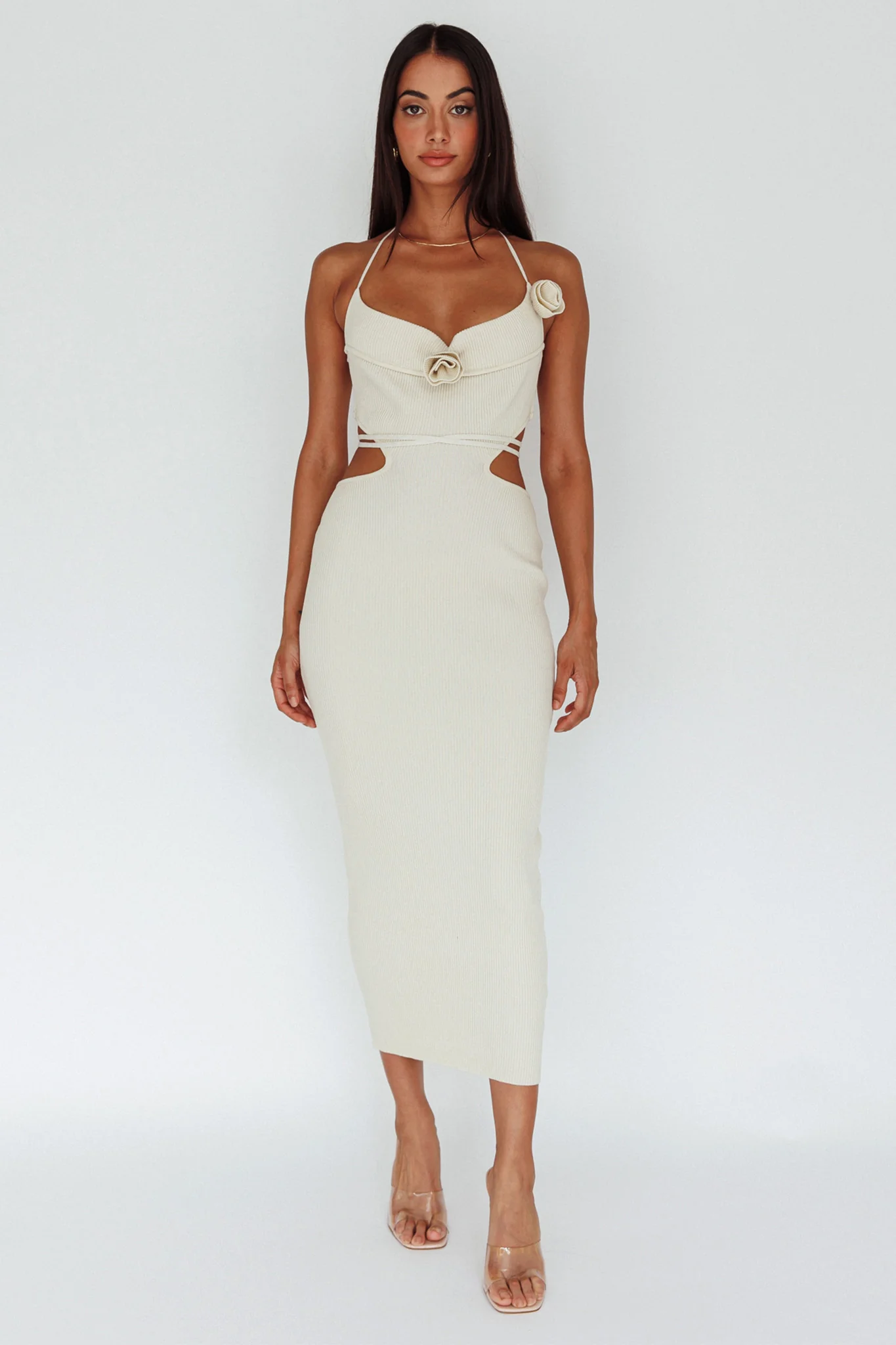 Rue Rose Accent Ribbed Knit Midi Dress Beige