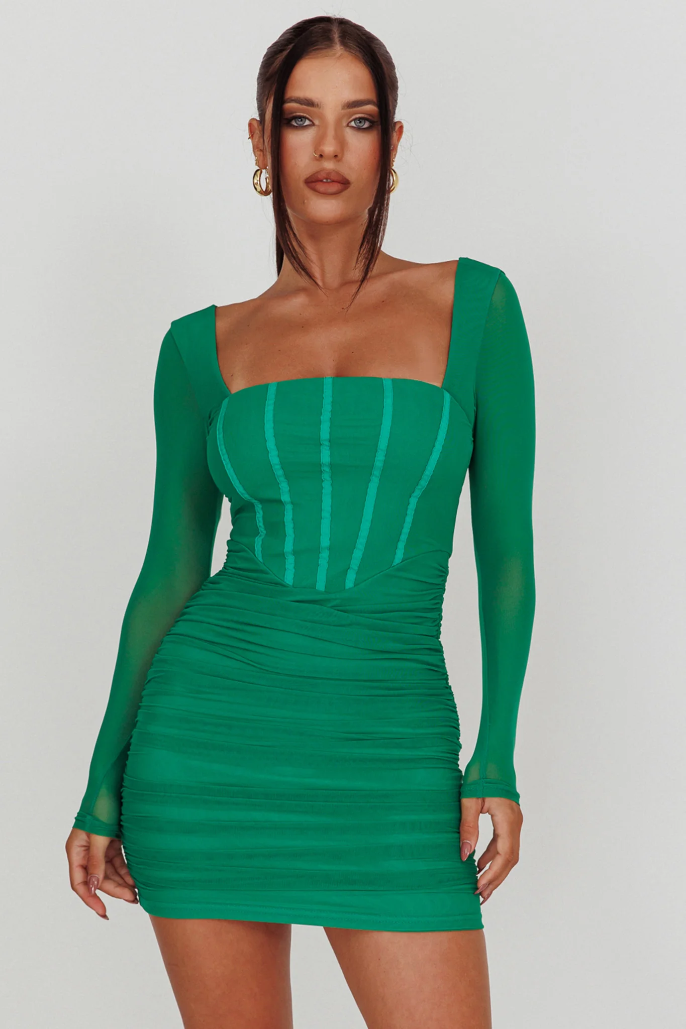 Dream Catcher Long Sleeve Ruched Mini Dress Green
