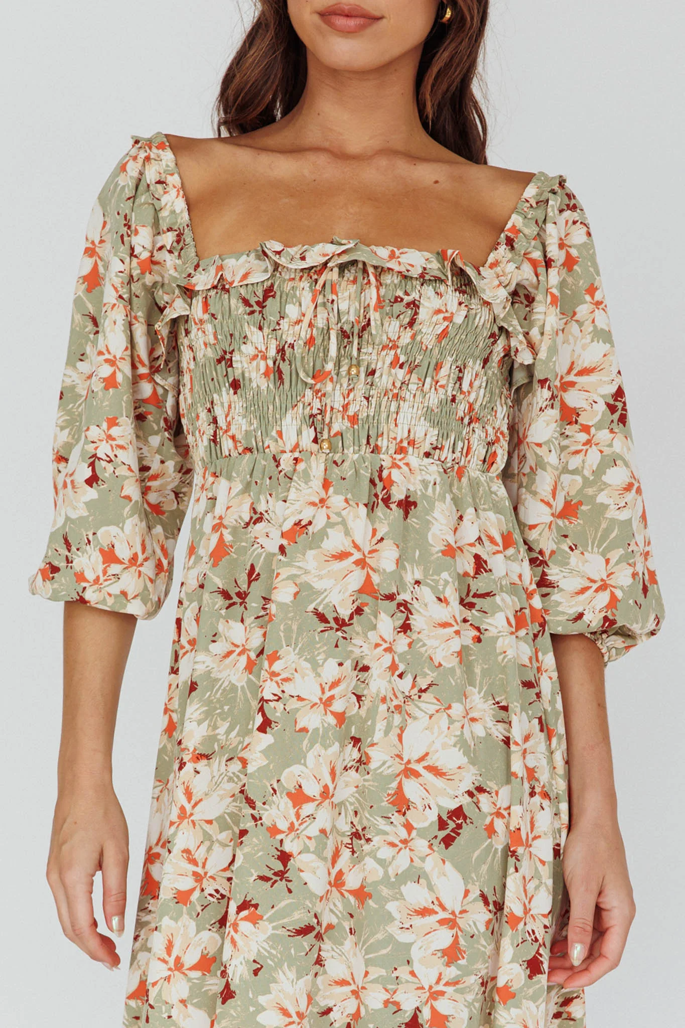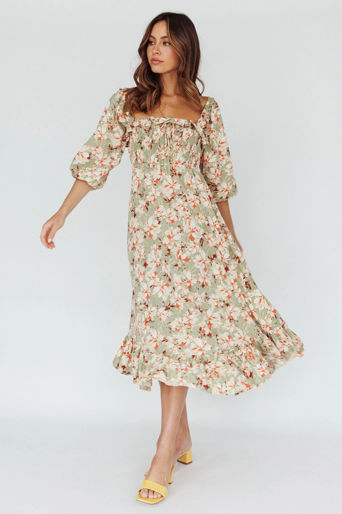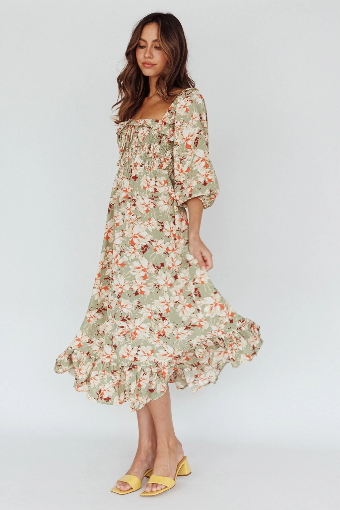Flynn Balloon Sleeve Shirred Midi Dress Floral Green