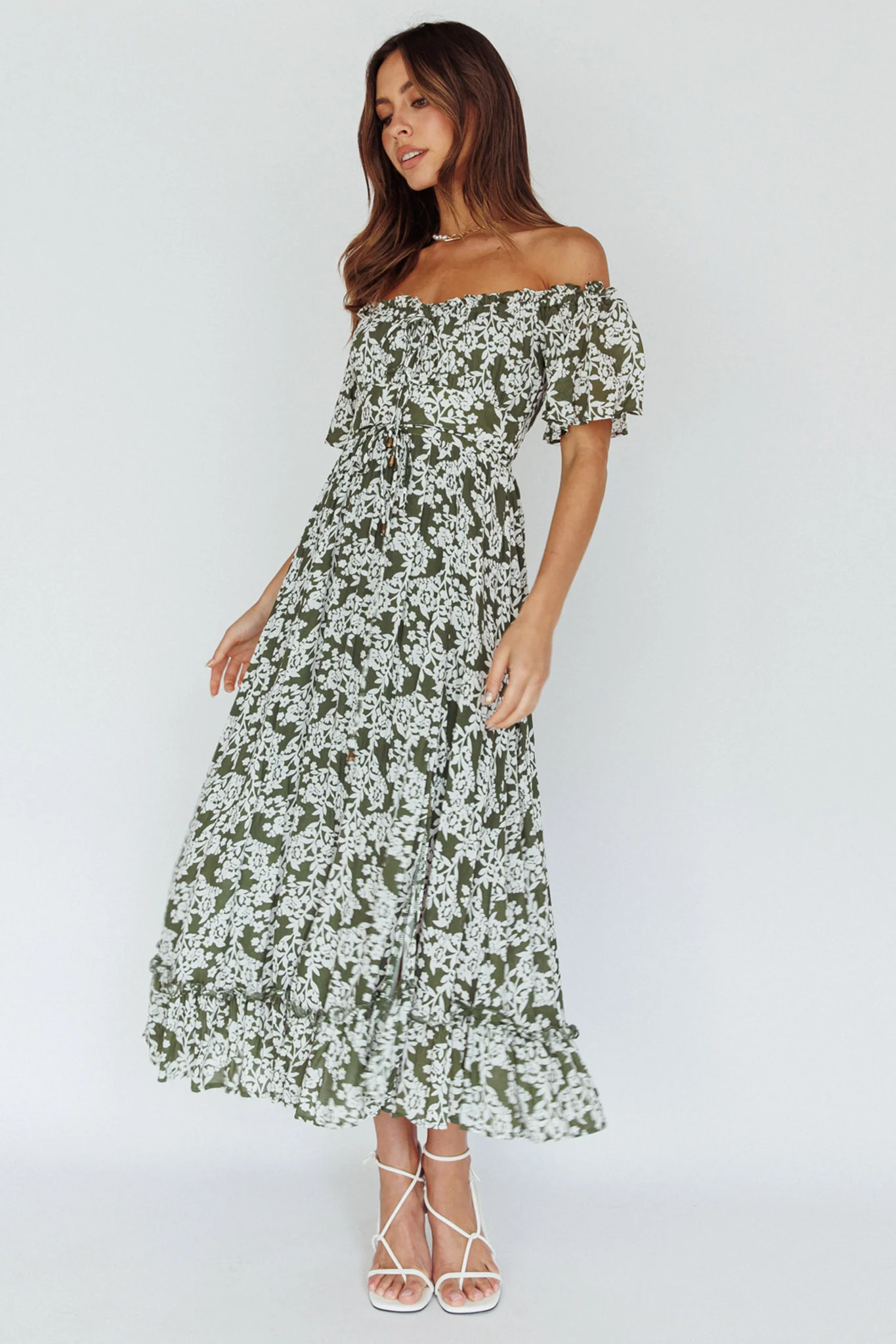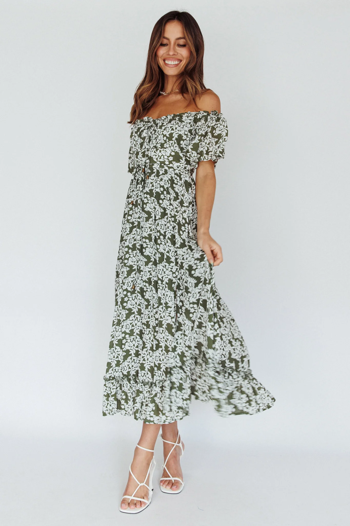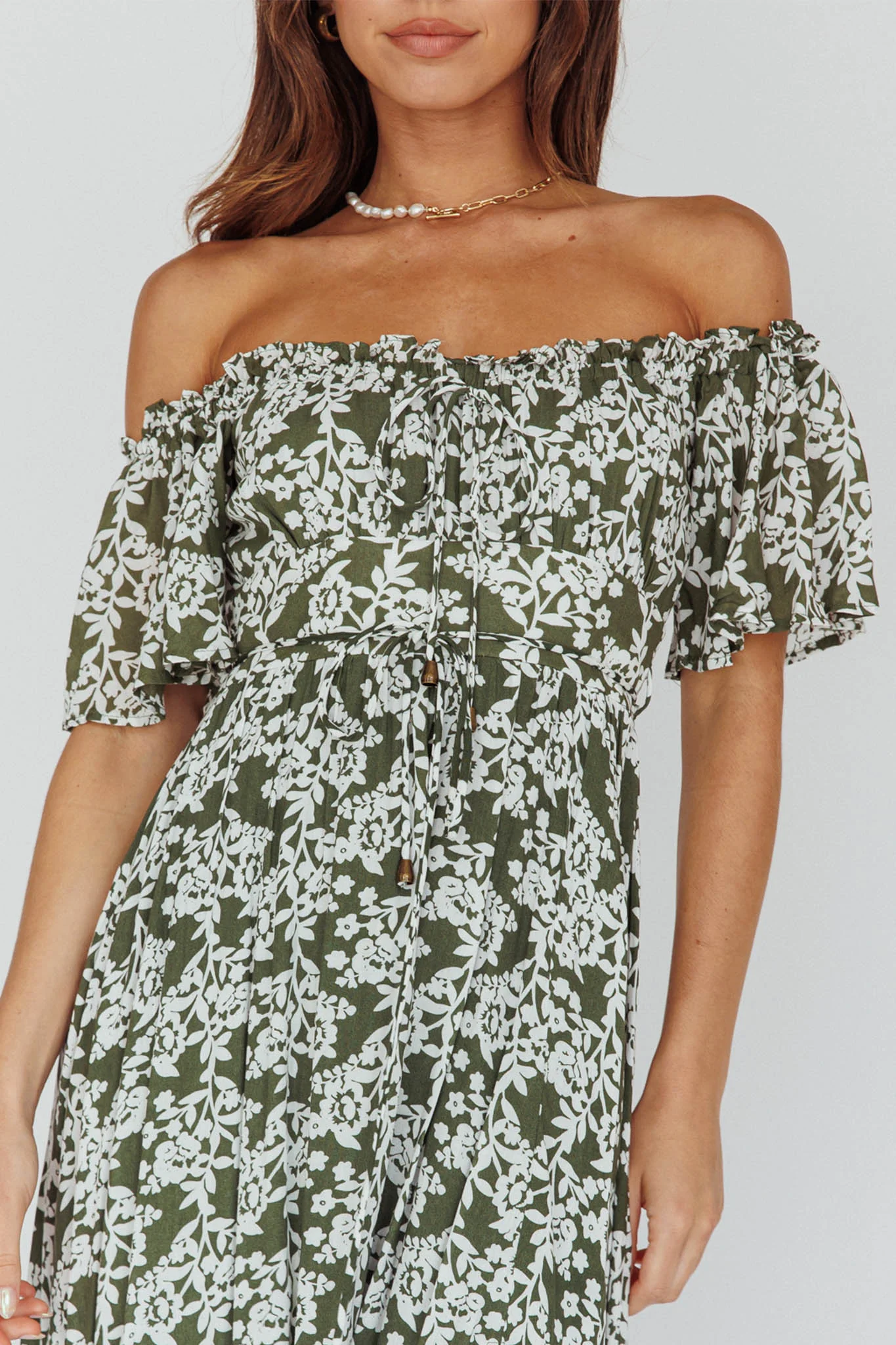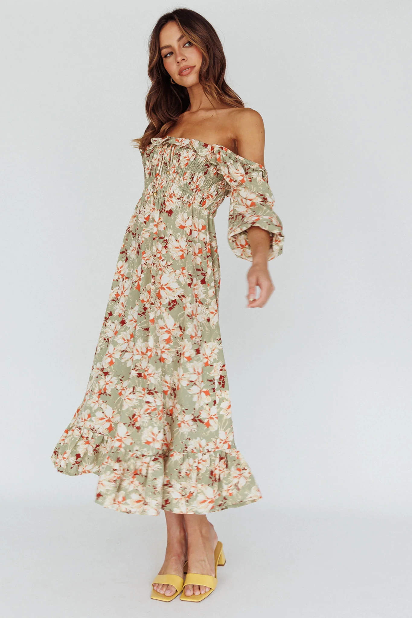 Voyager Off-Shoulder Bell Sleeve Midi Dress Floral Green