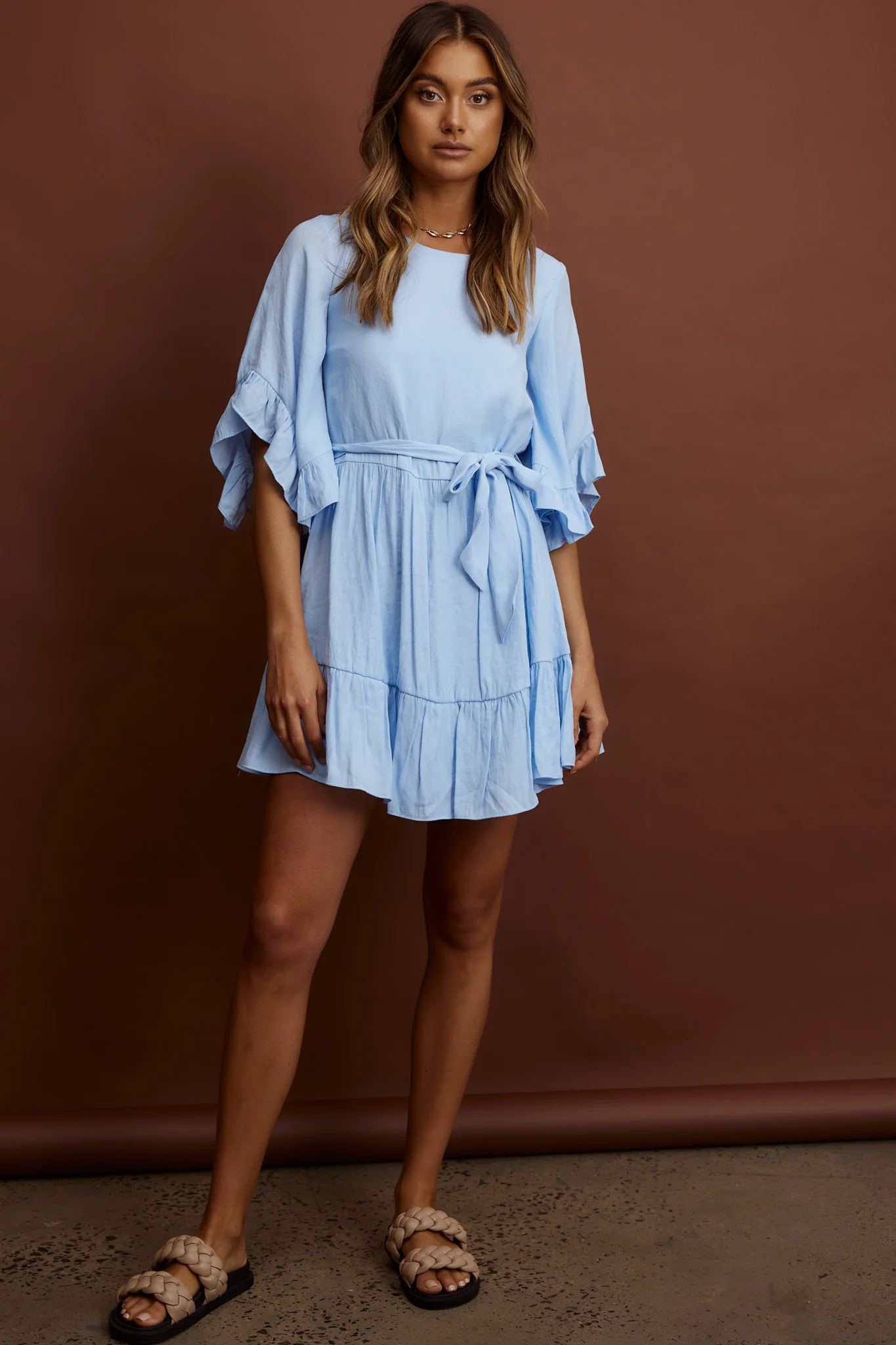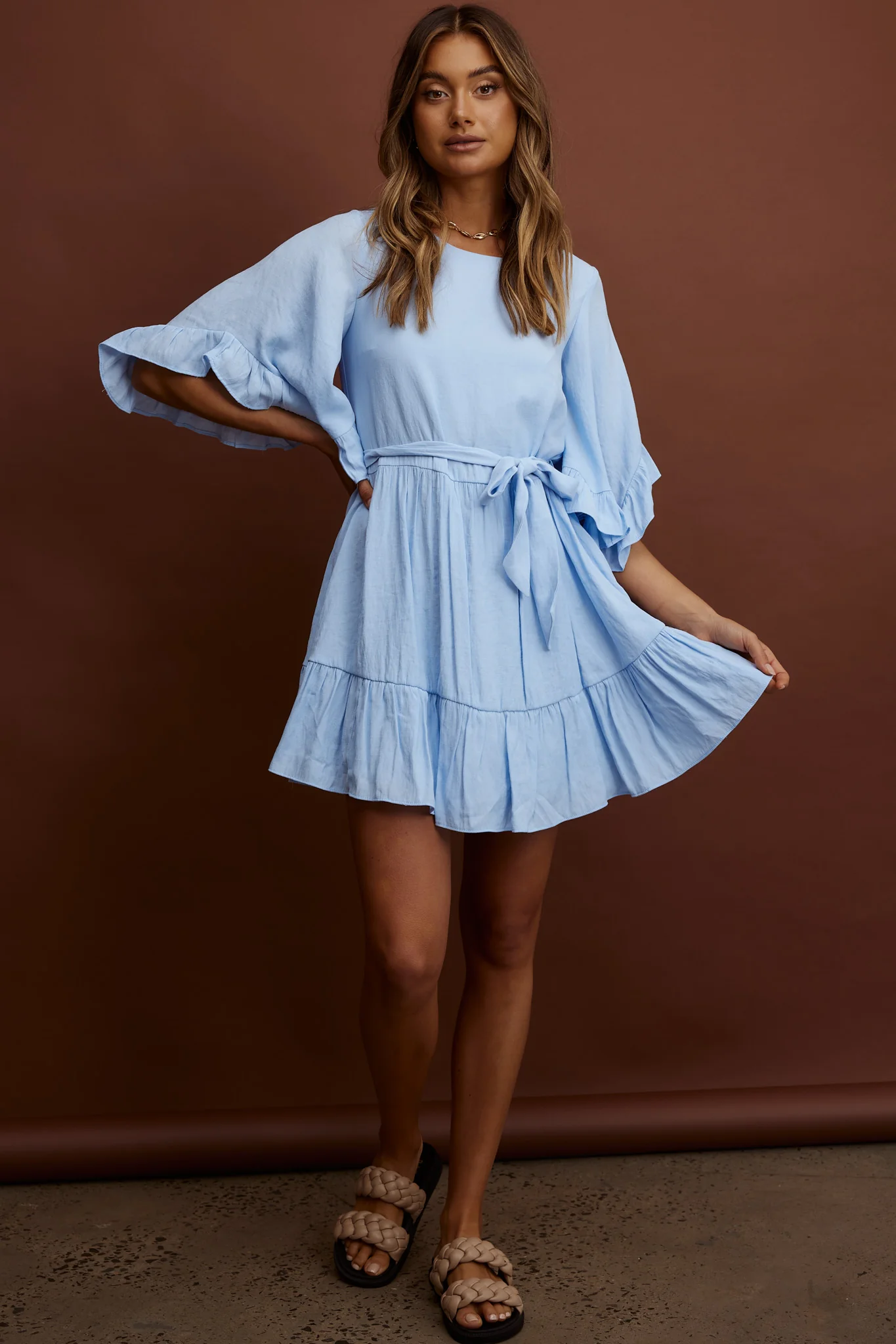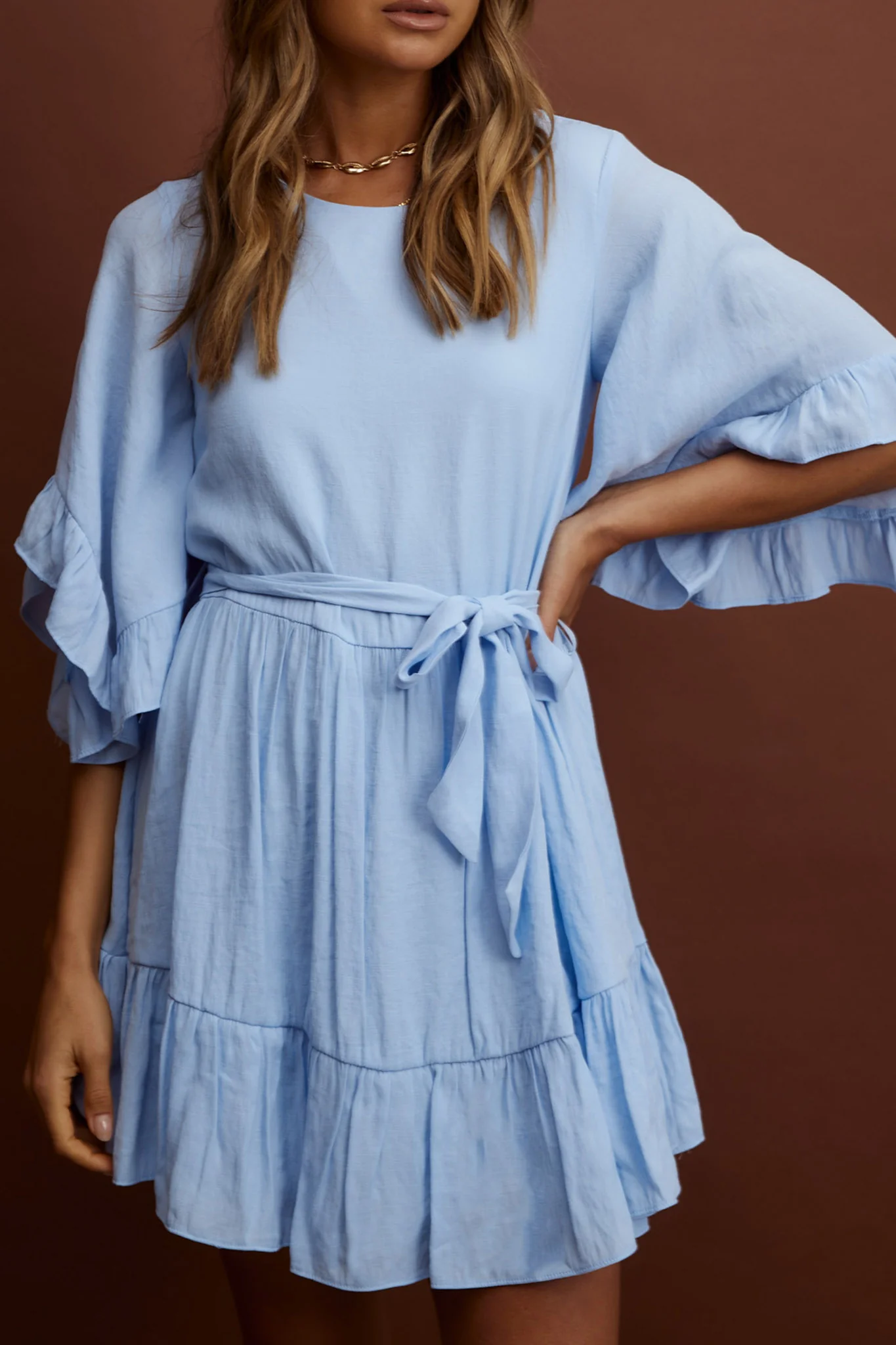Joni Batwing Sleeve Waist Tie Dress Ruffle Blue
