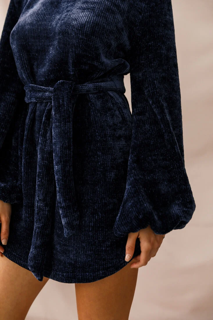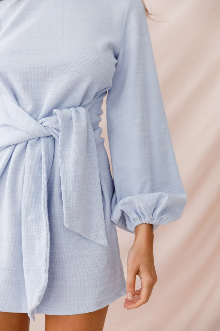 Rapt Waist Tie Bishop Sleeve Knit Dress Steel Blue