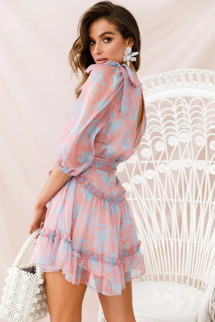 Camellia Open Back Cuff Sleeve Dress Blush Floral