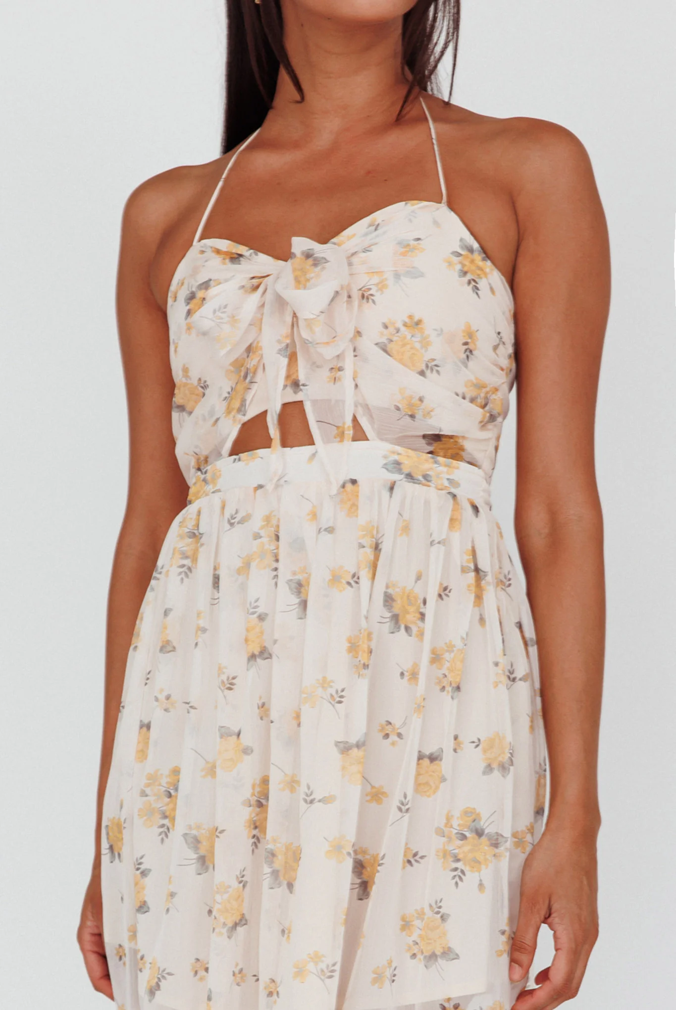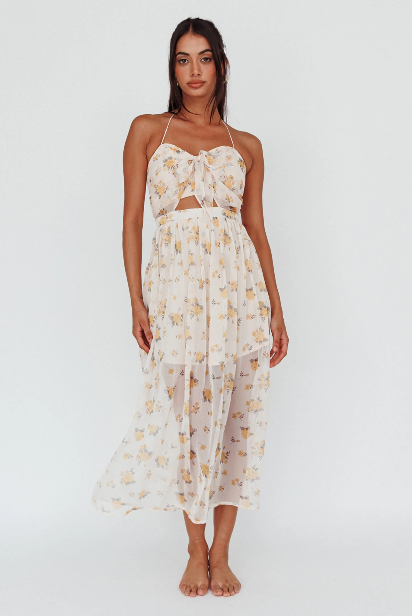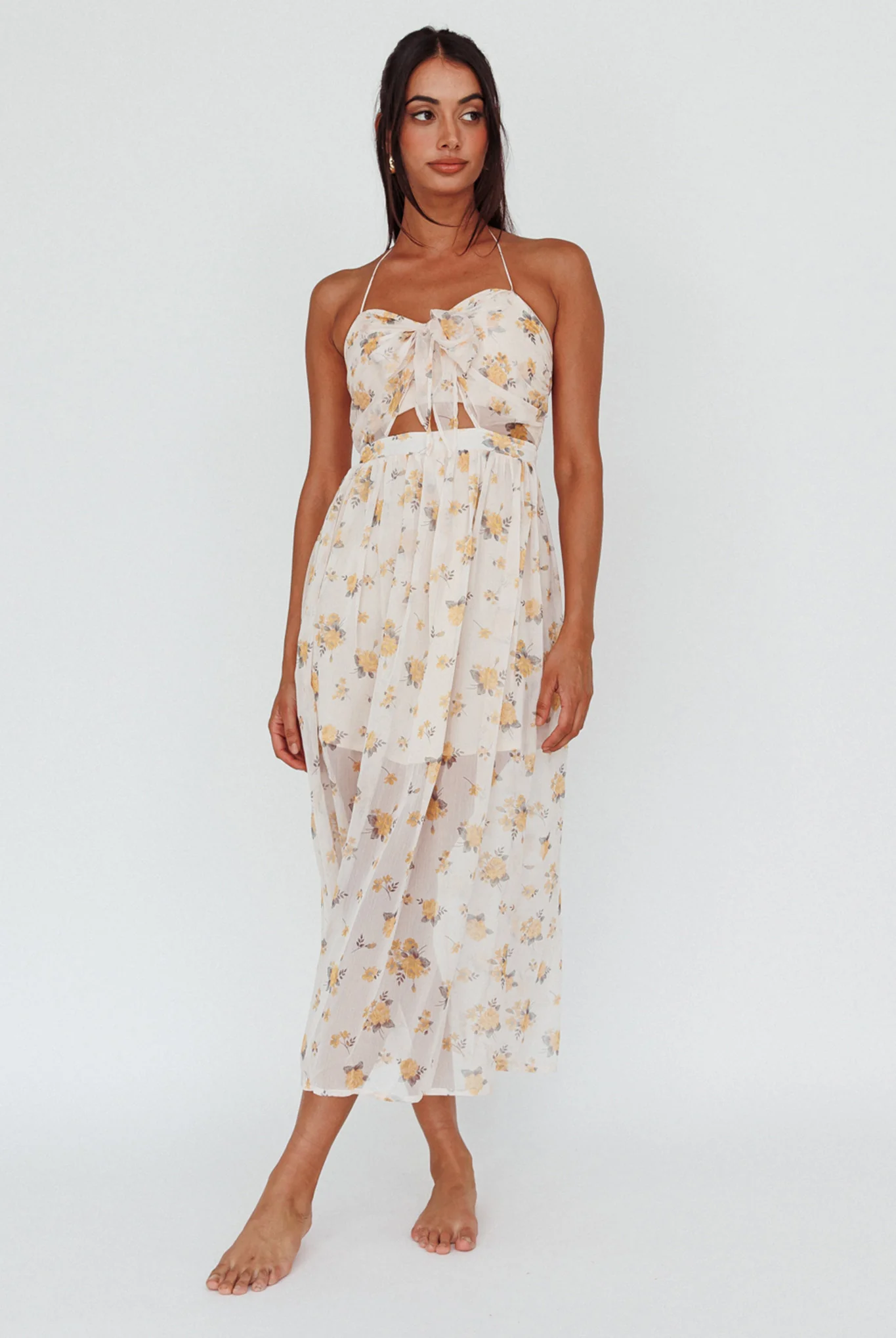 Los Feliz Tied Bust Halterneck Midi Dress Sheer Floral Yellow
