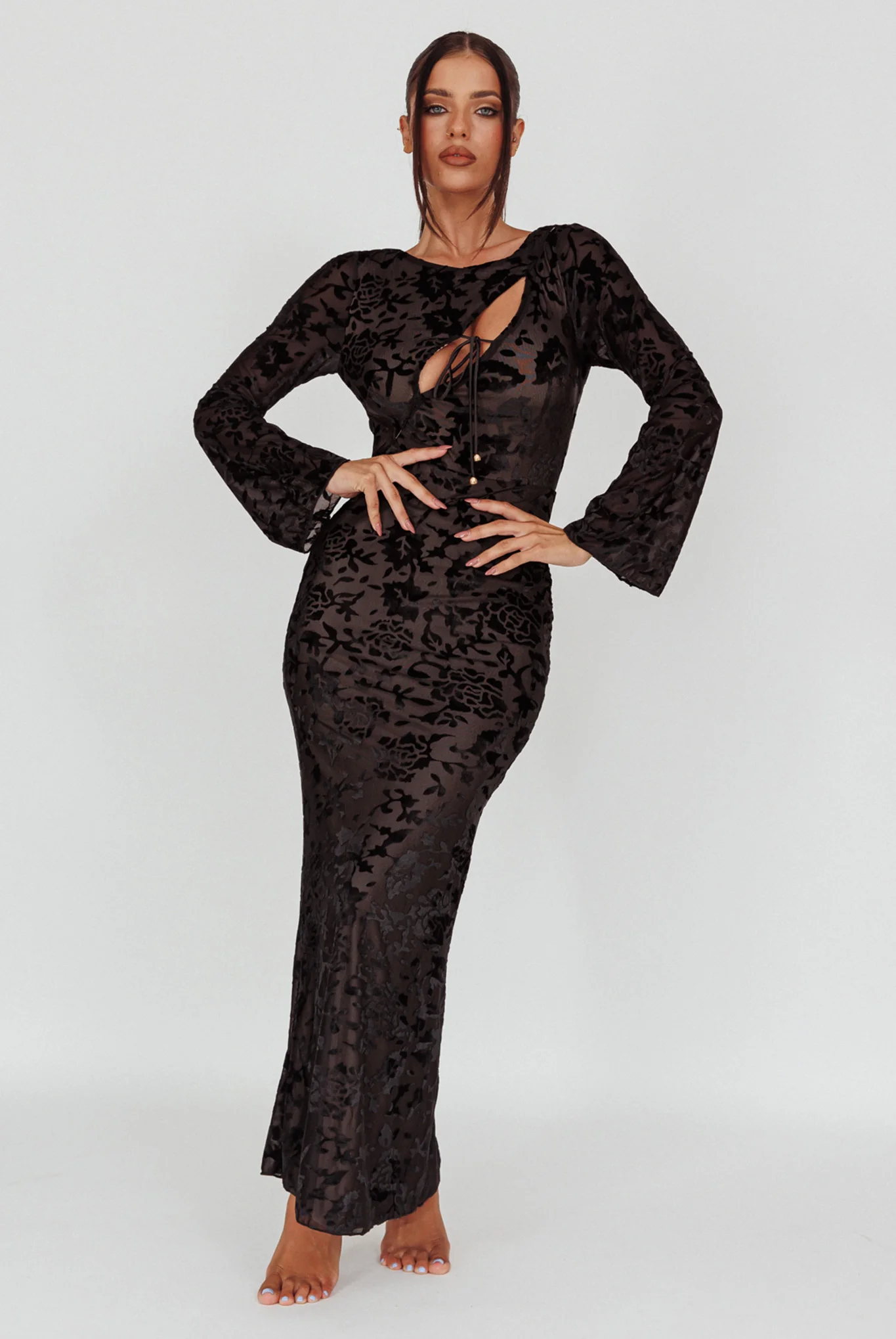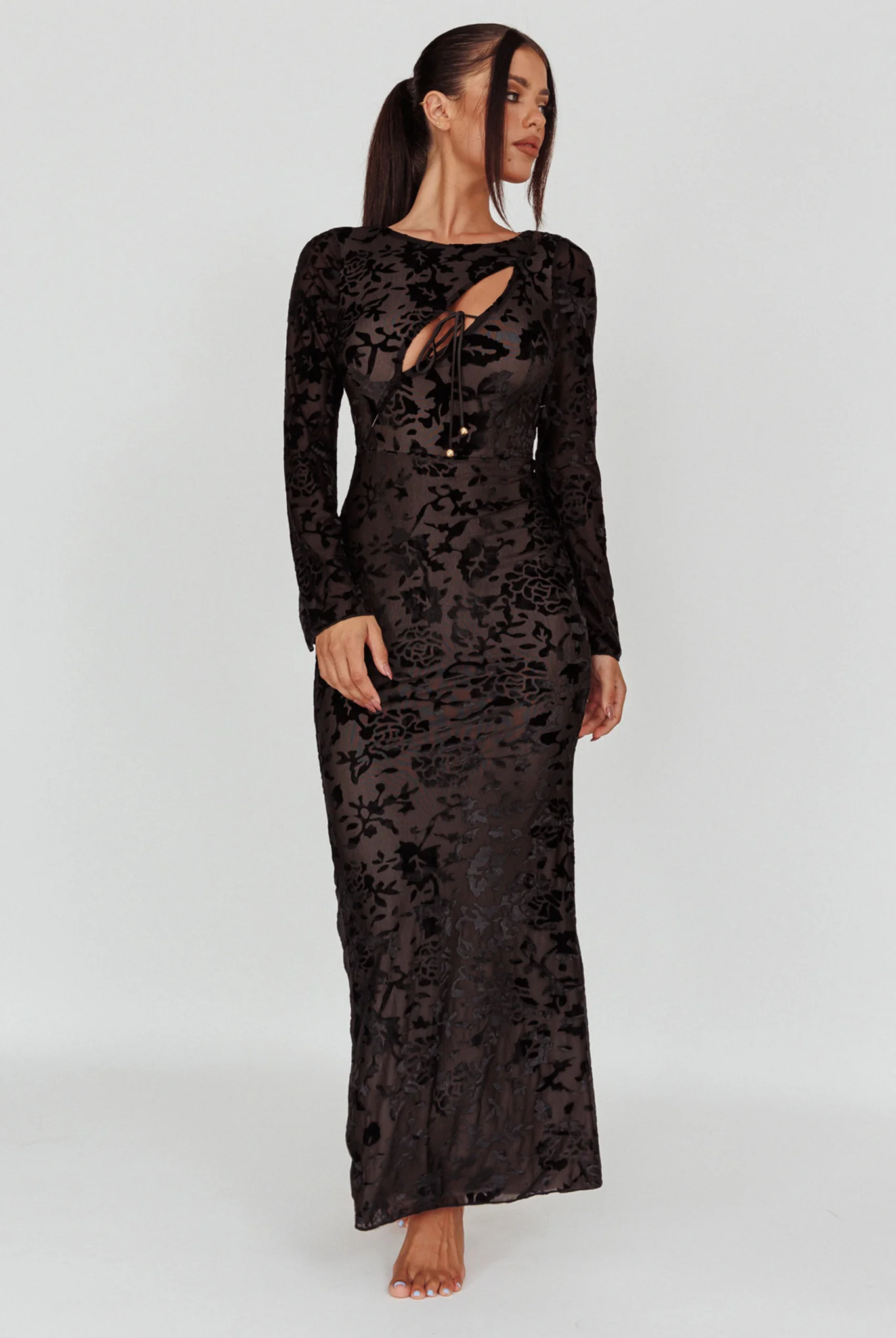 Novalie Long Sleeve Velvet Print Midi Dress Black