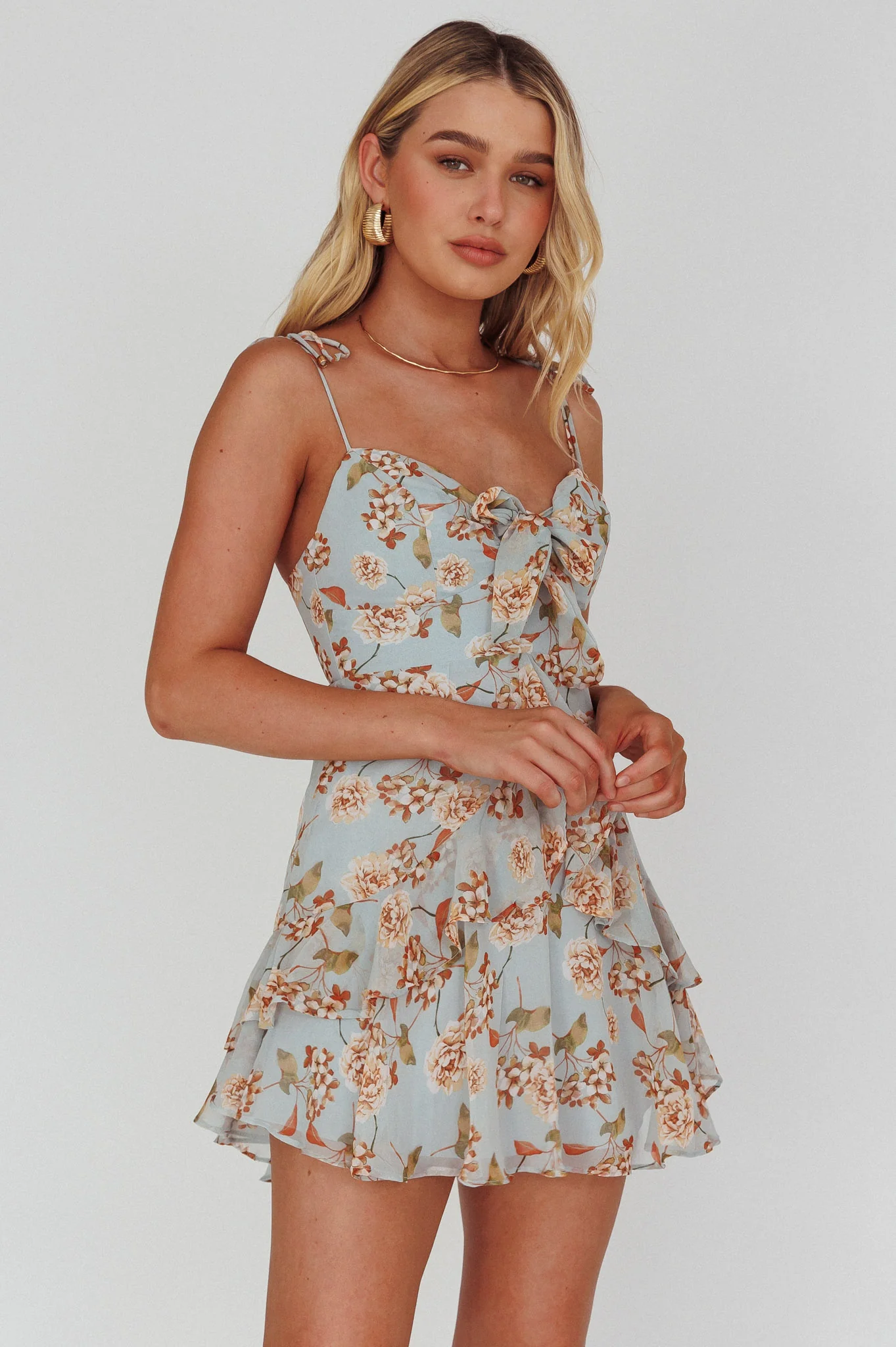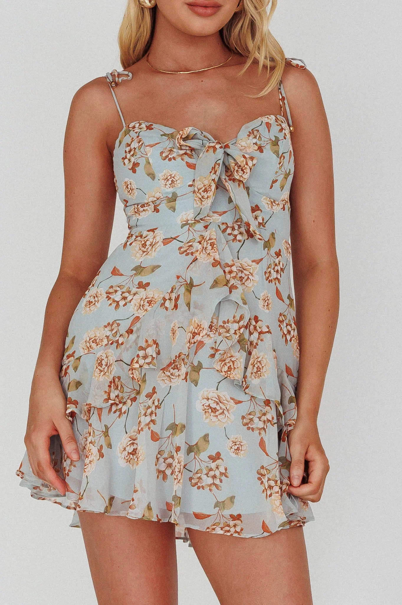 Flower Child Bust Tie Ruffle Trim Dress Rose Print Blue