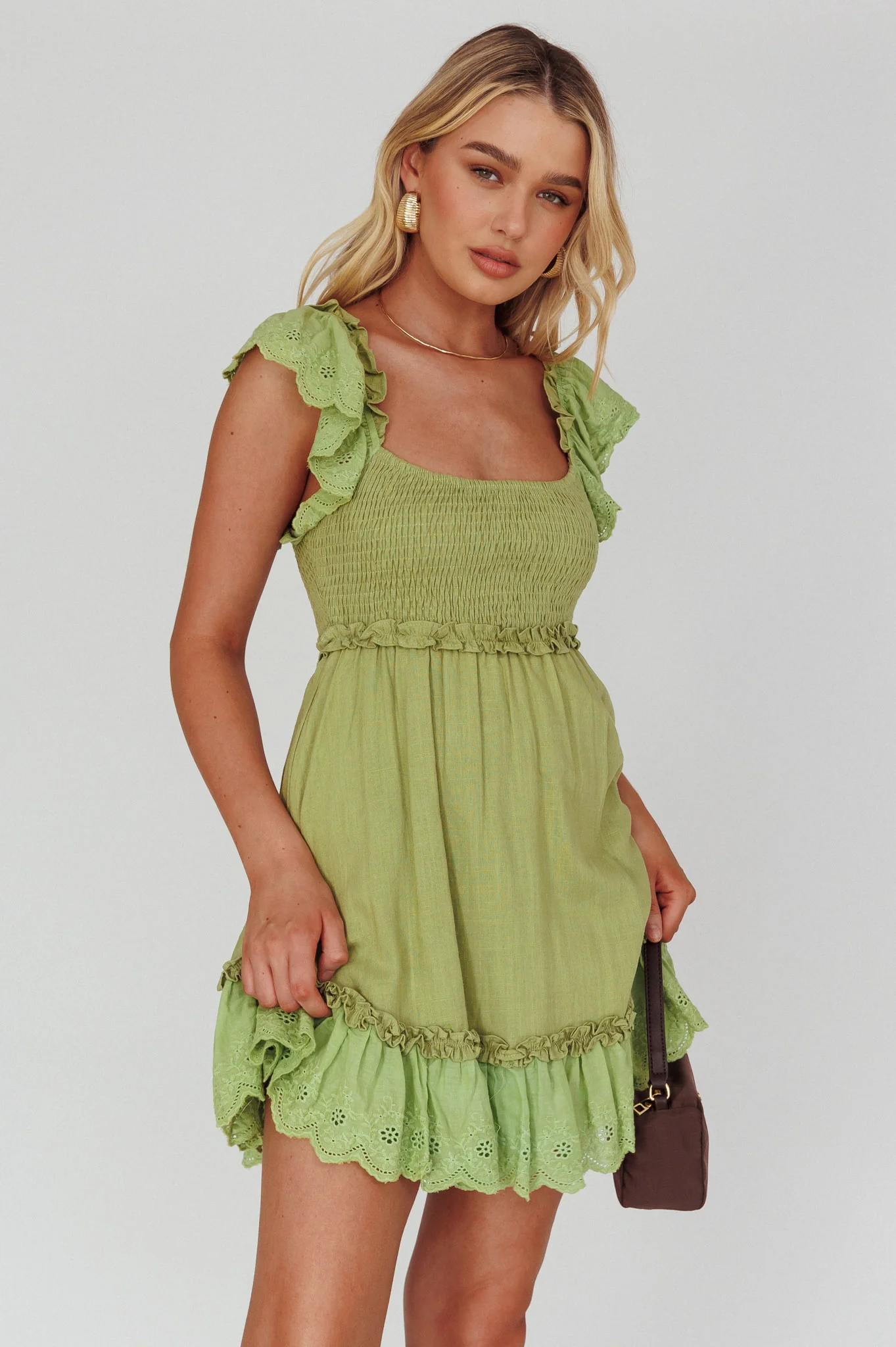 Bay Breeze Frill Shoulder Shirred Bodice Dress Olive