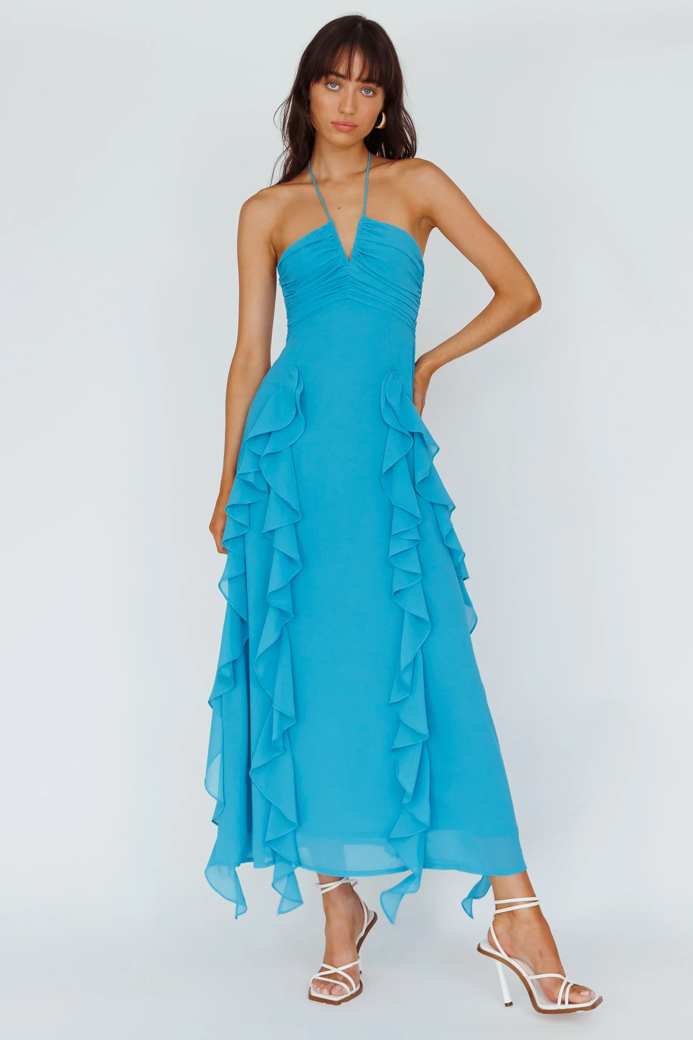 Asiah Ruffle Trim Halterneck Maxi Dress Cerulean Blue