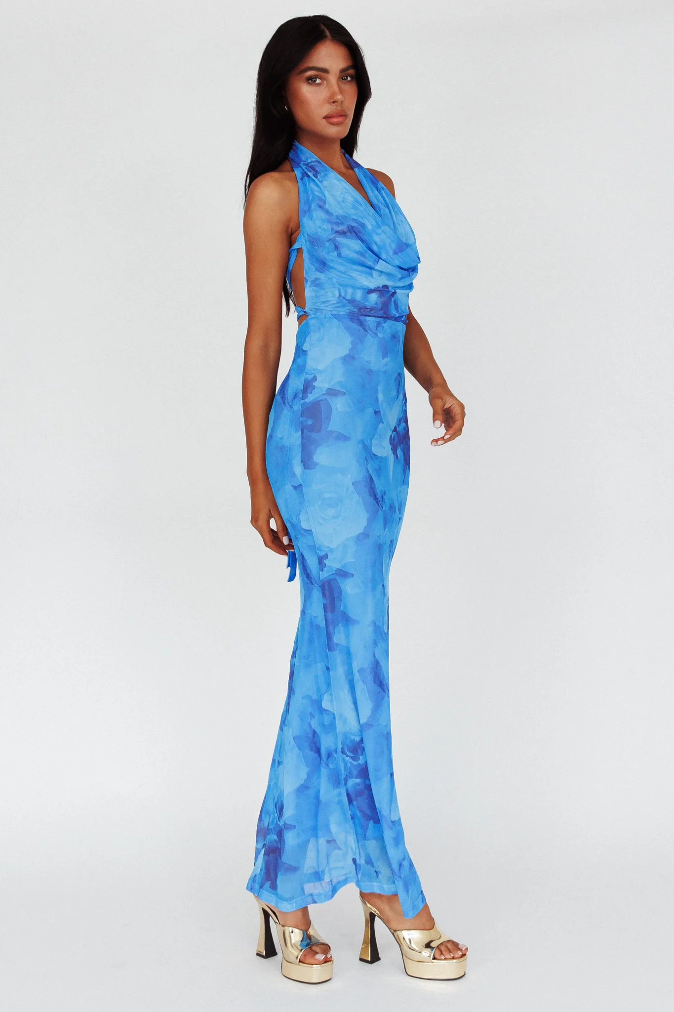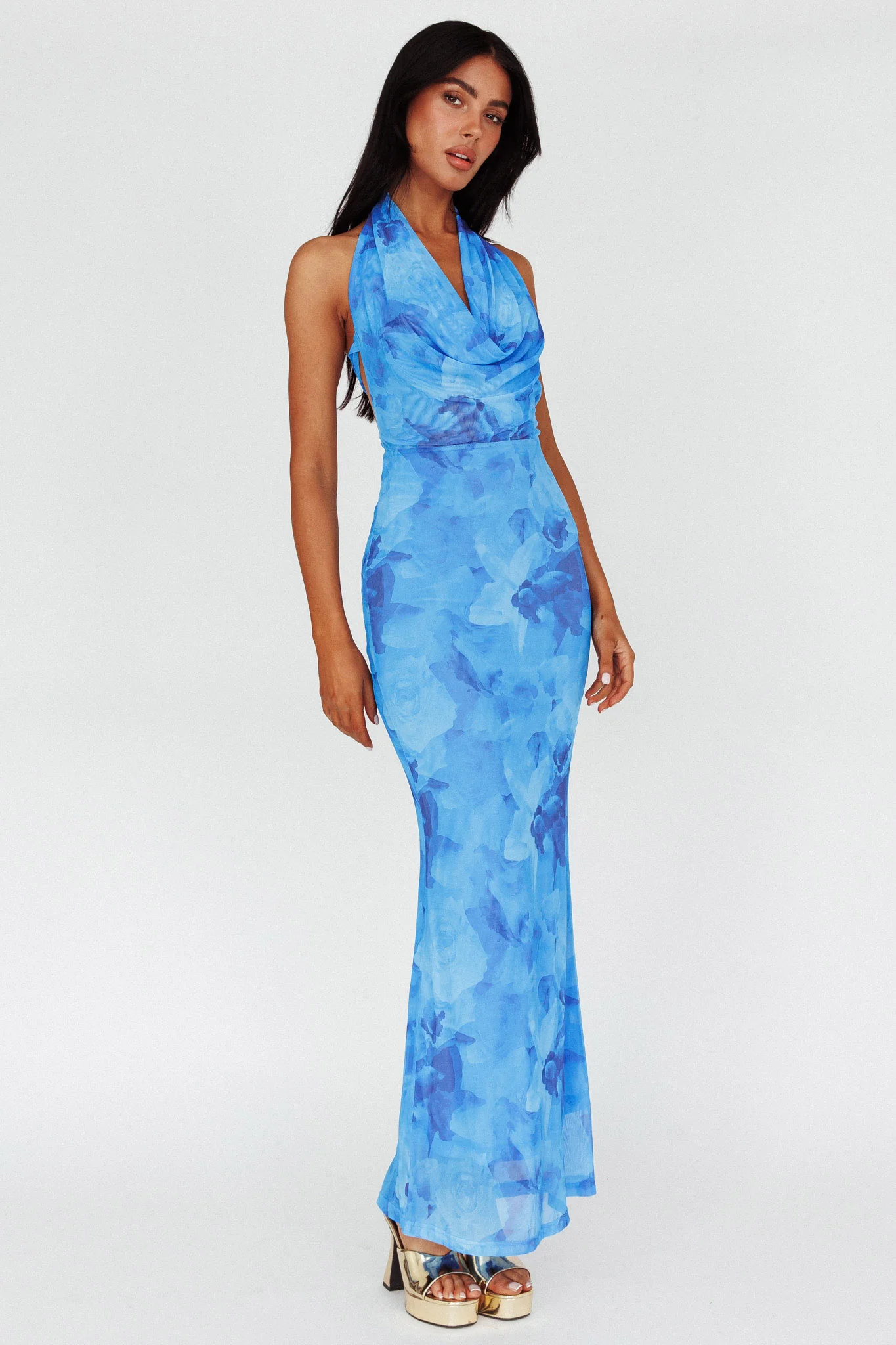 Amalfi Sunset Cowl Halterneck Maxi Dress Sky