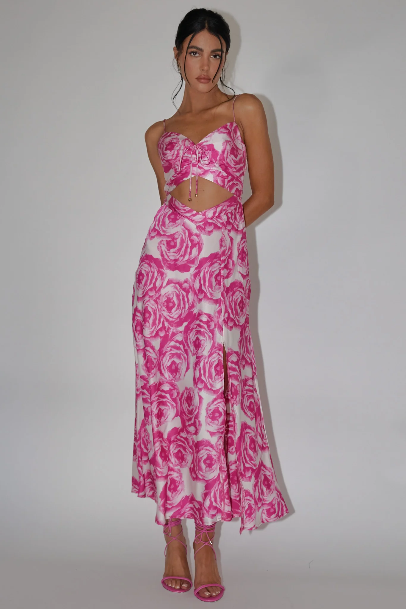 Twin Flame Drawstring Bust Midi Dress Floral Pink
