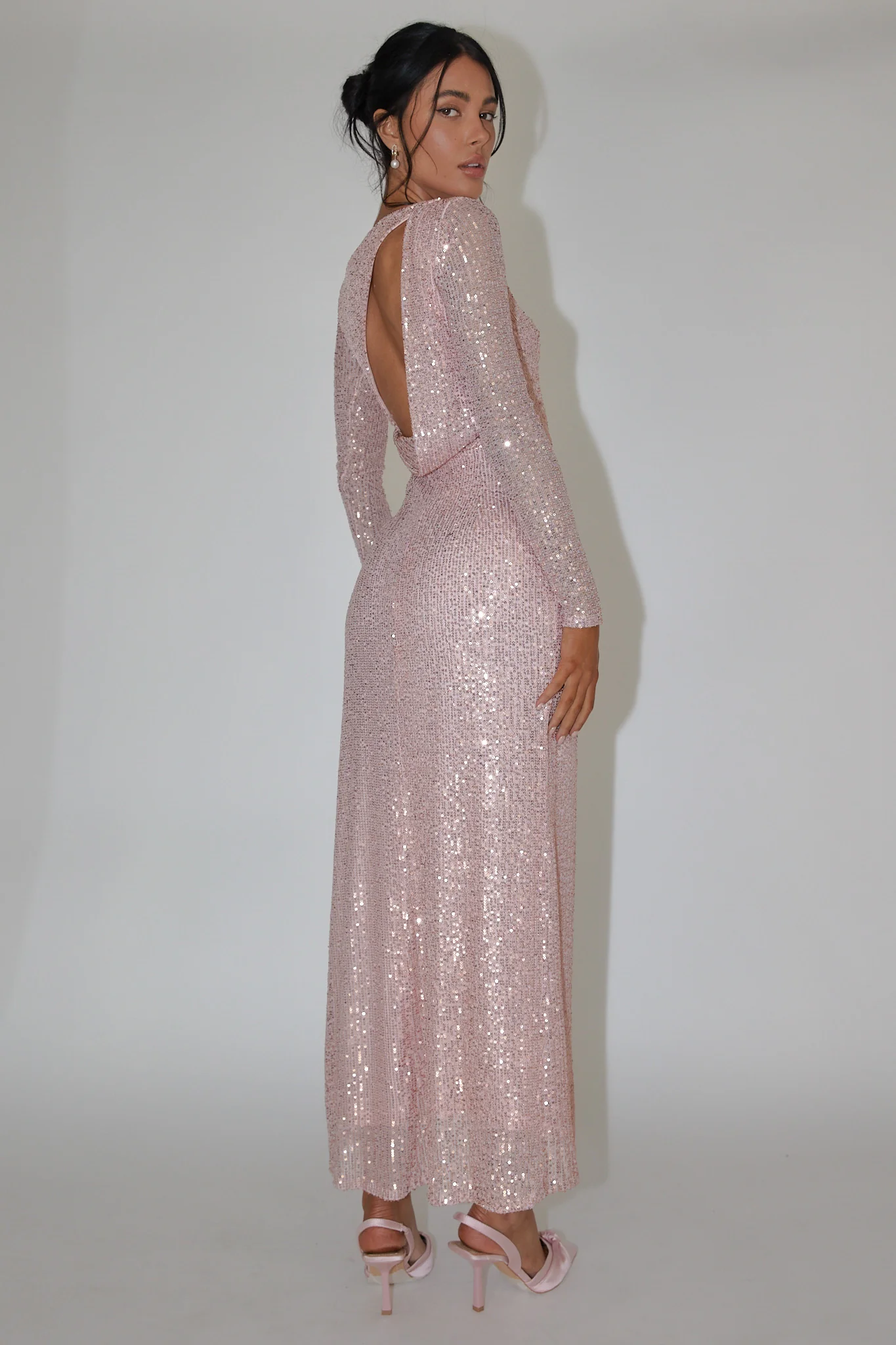 Le Monde Long Sleeve Sequin Maxi Dress Rose Gold