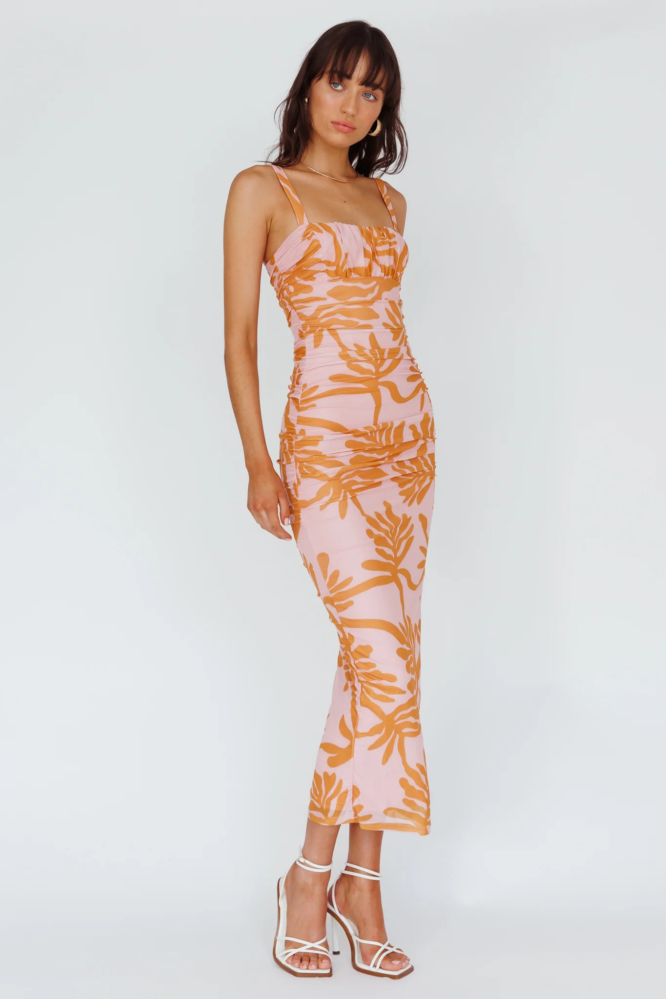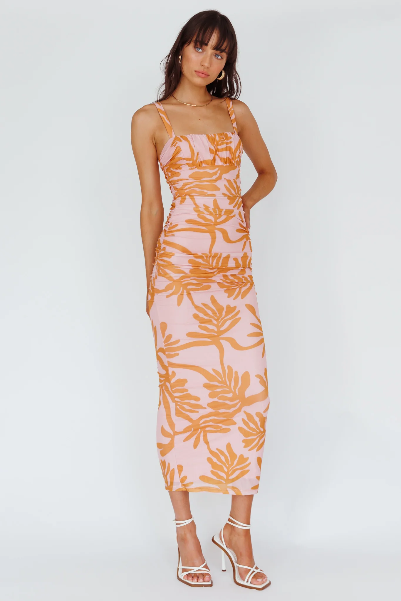Kindred Soul Ruched Mesh Midi Dress Floral Pink