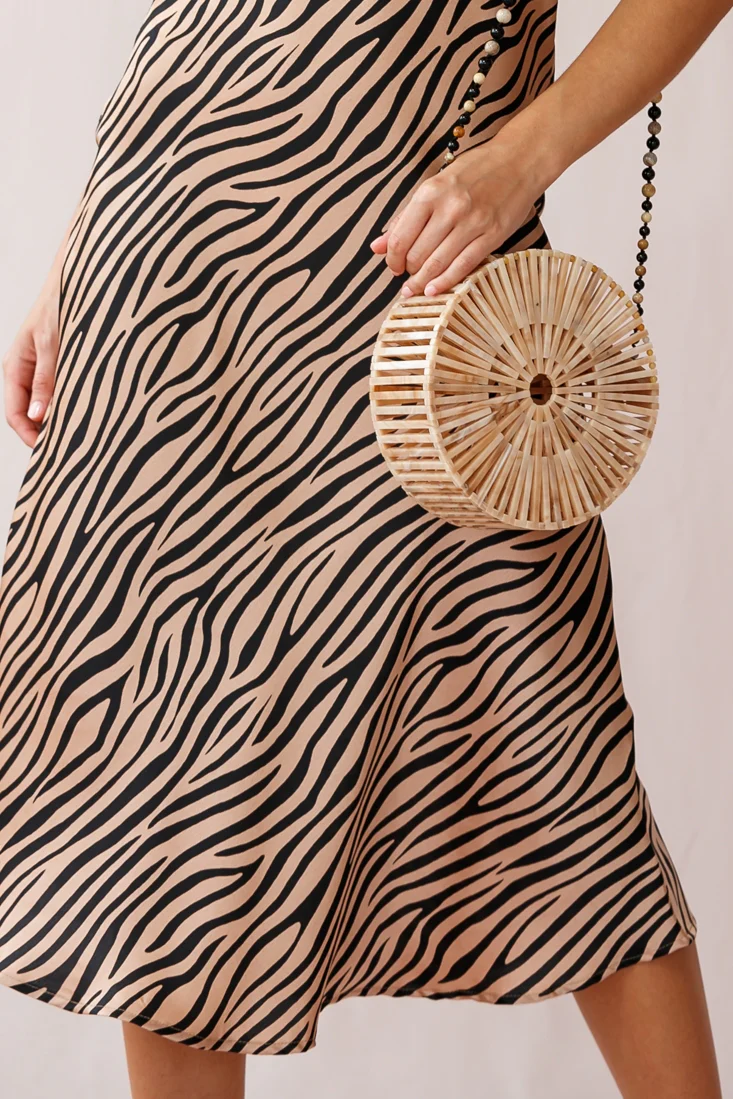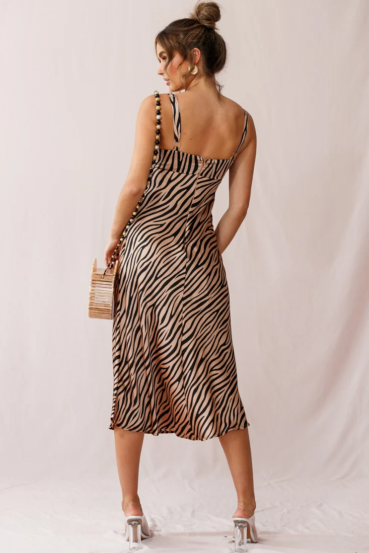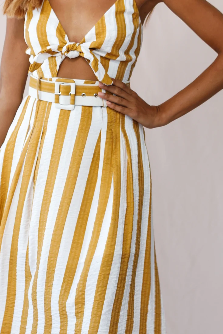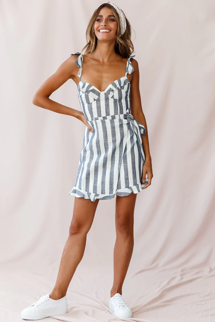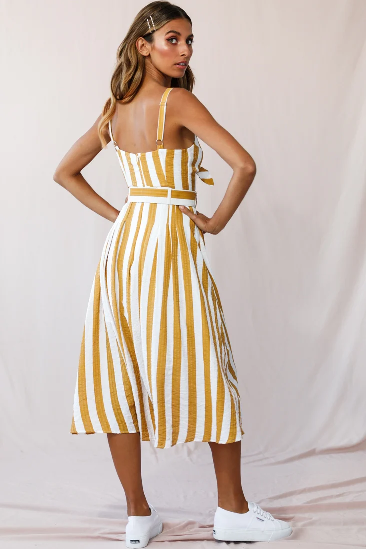 Lana String Tie Fluted Hem Dress White/Mocha Stripe