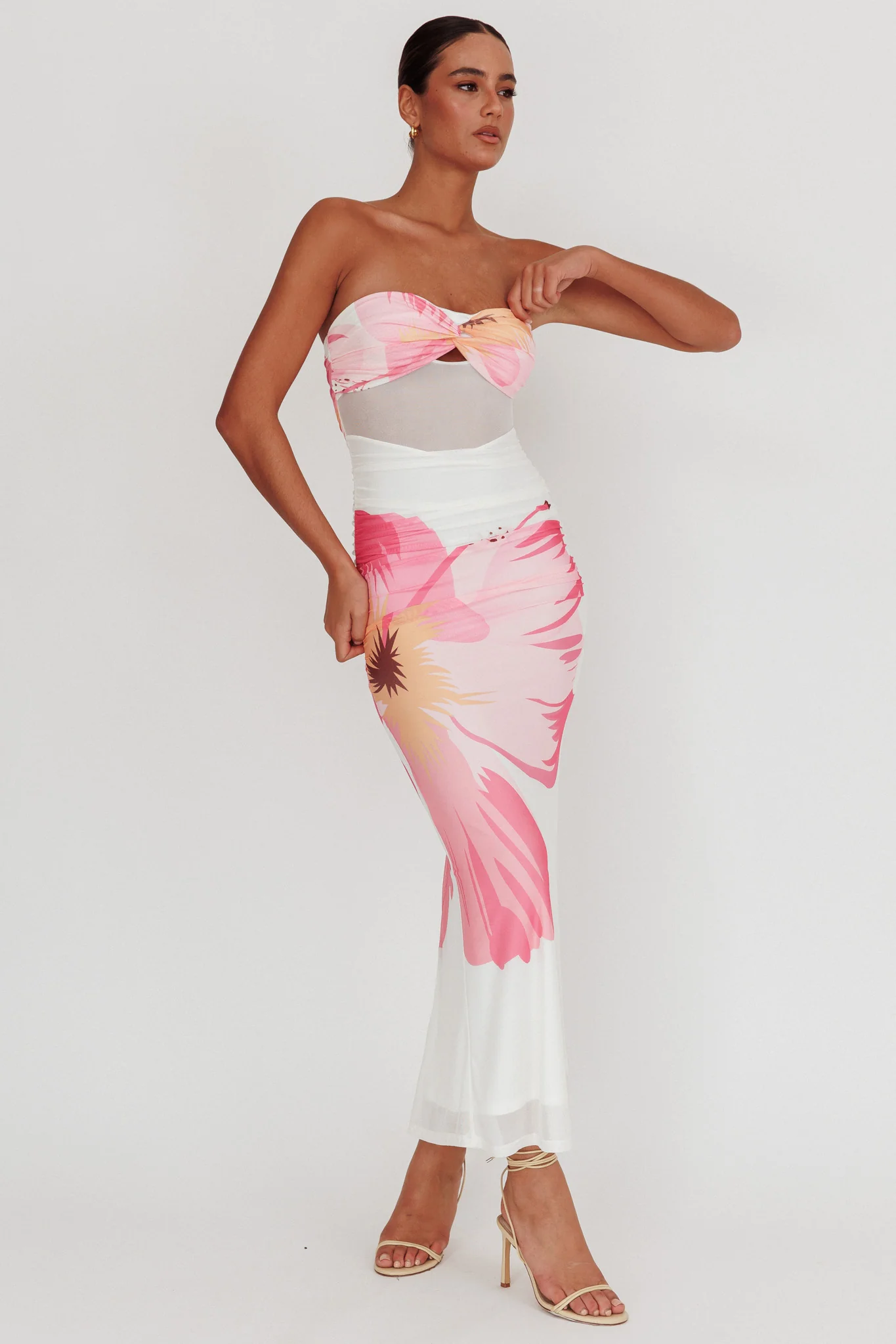 Oliana V-Neck Mesh Maxi Dress Hibiscus White/Pink