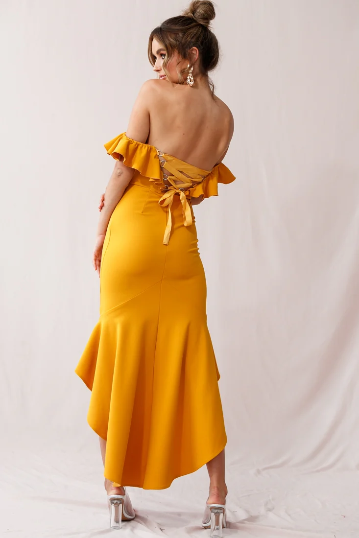 Cloud 9 Bardot Neckline Corset Back Dress Mustard