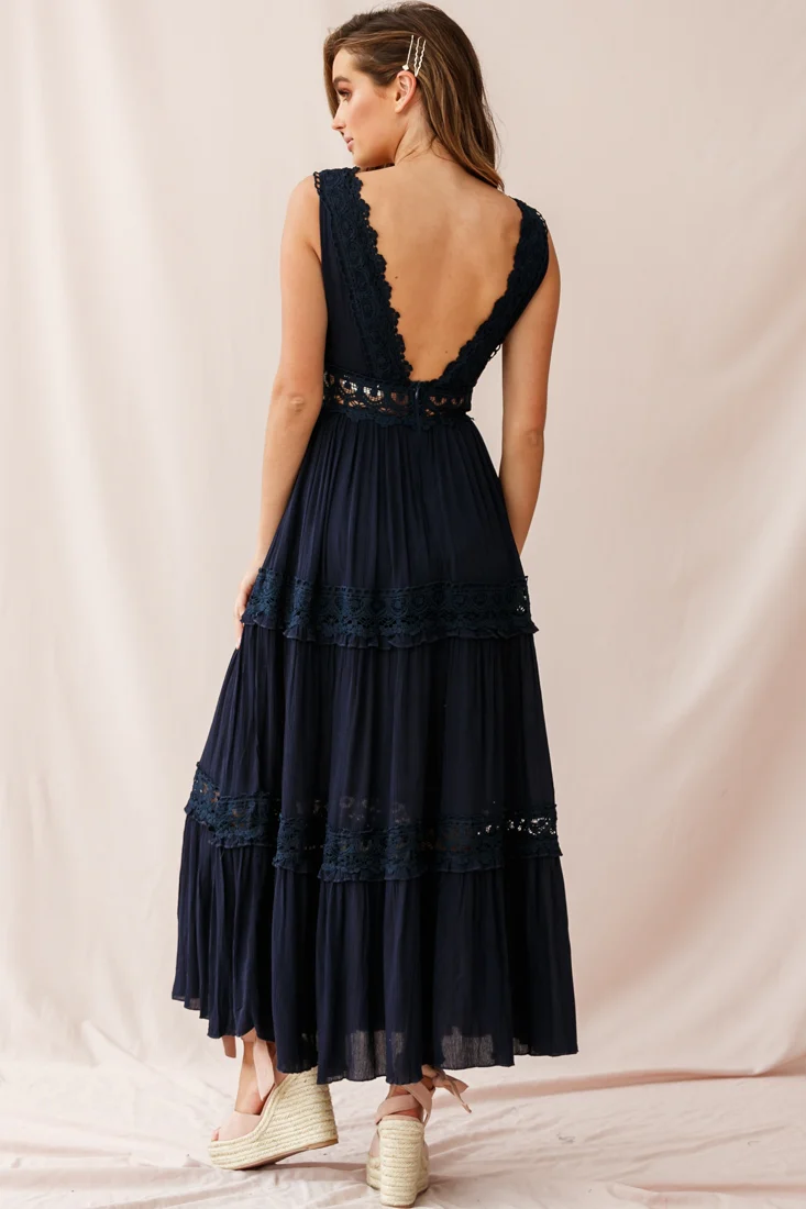 Indio Crochet Insert Deep V-Neckline Maxi Dress Navy