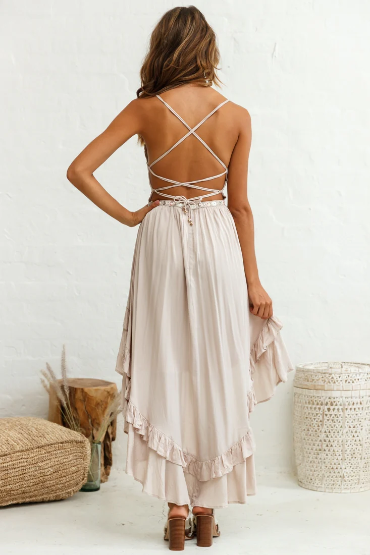 Virgo High-Low Hem Lace-Up Dress Beige
