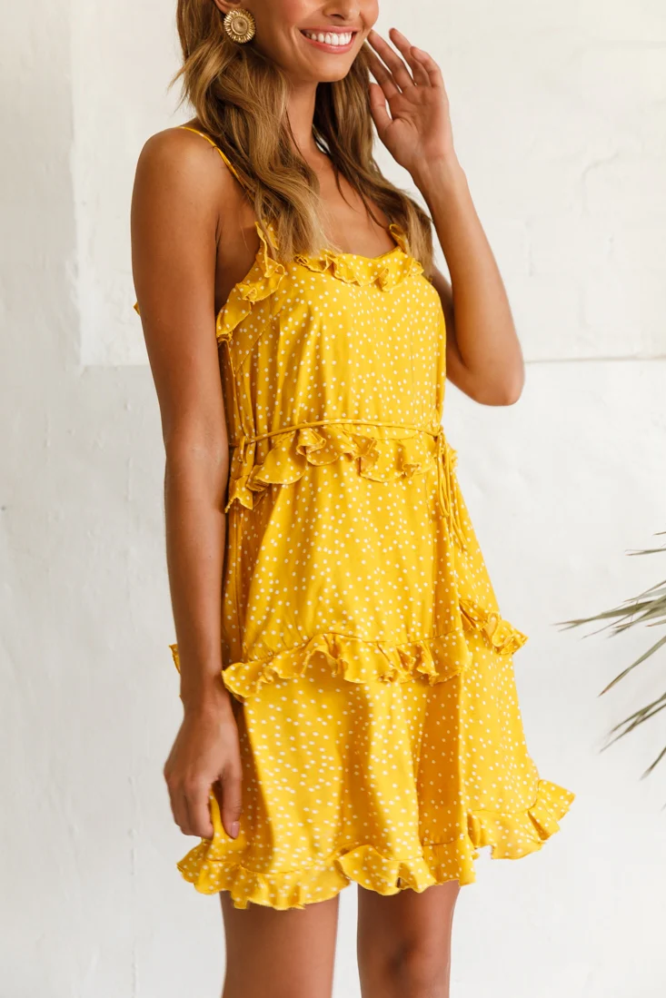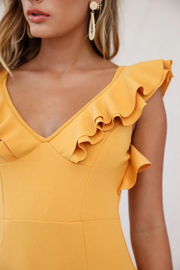 Pearl Ruffle Strap Mini Dress Mustard