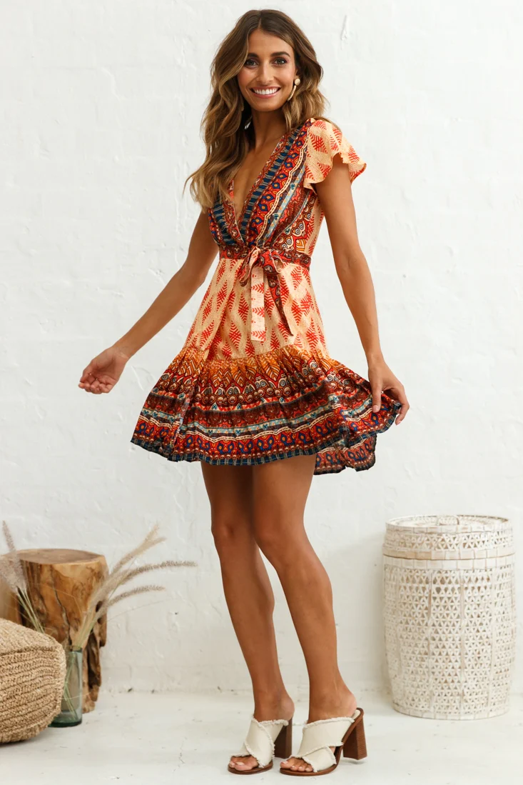 Ariya V-Neckline Frill Hem Sun Dress Red Print