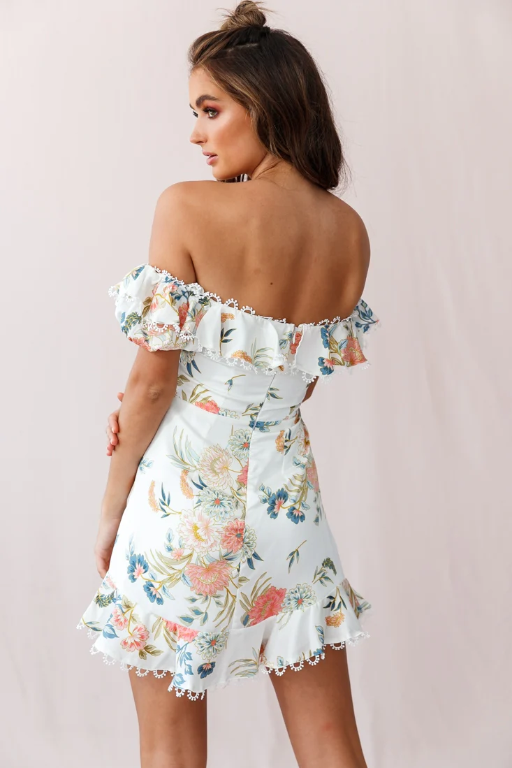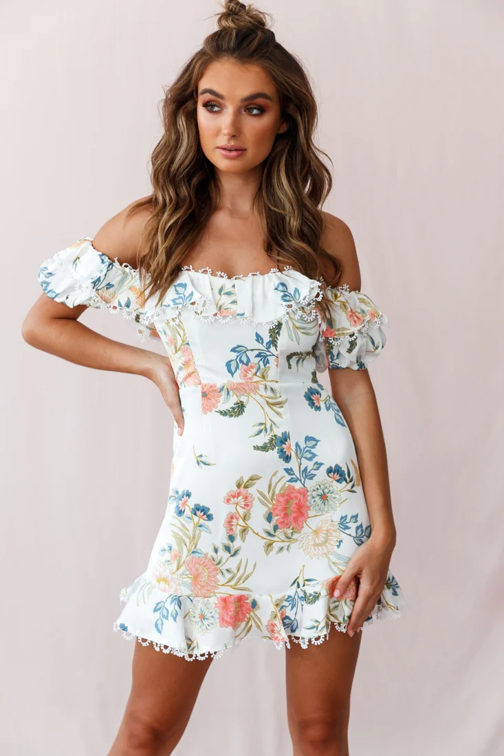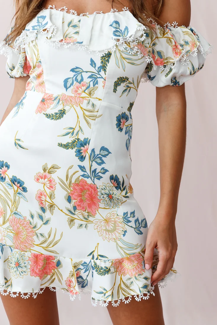 Bobby Bardot Neckline Puff Sleeve Dress Floral Print White